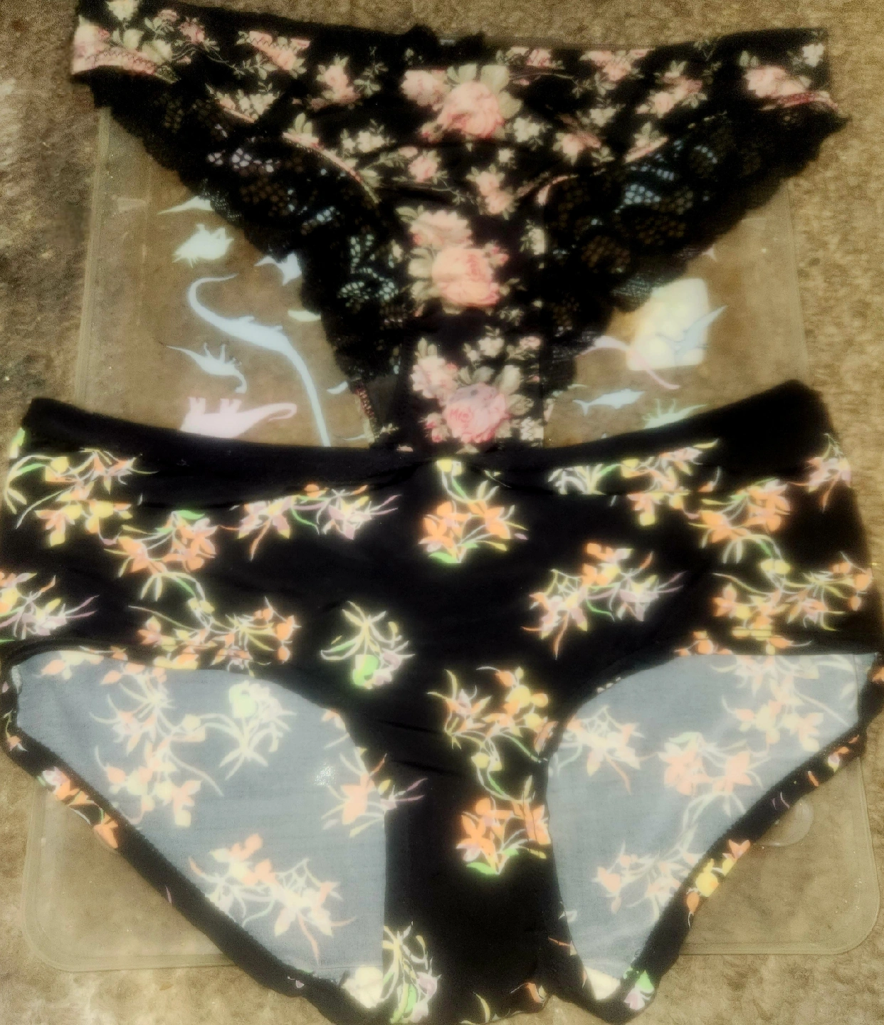 Two pairs of Aerie floral print panties up for grabs! One is a black floral lace thong, and the other is a black floral brief. Both are size XS and made of 90% nylon and 10% spandex. Yes I tried selling it before, but took it down for reason of backlash.