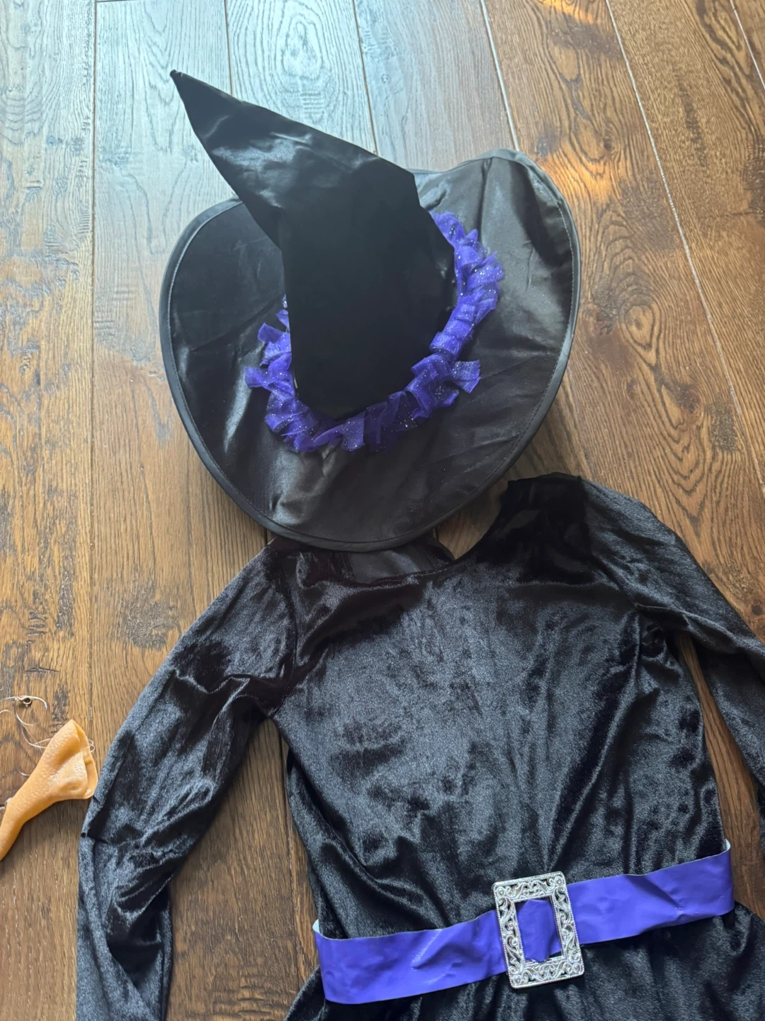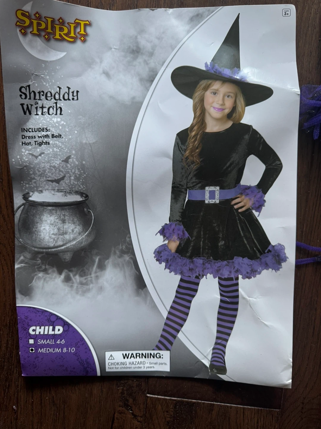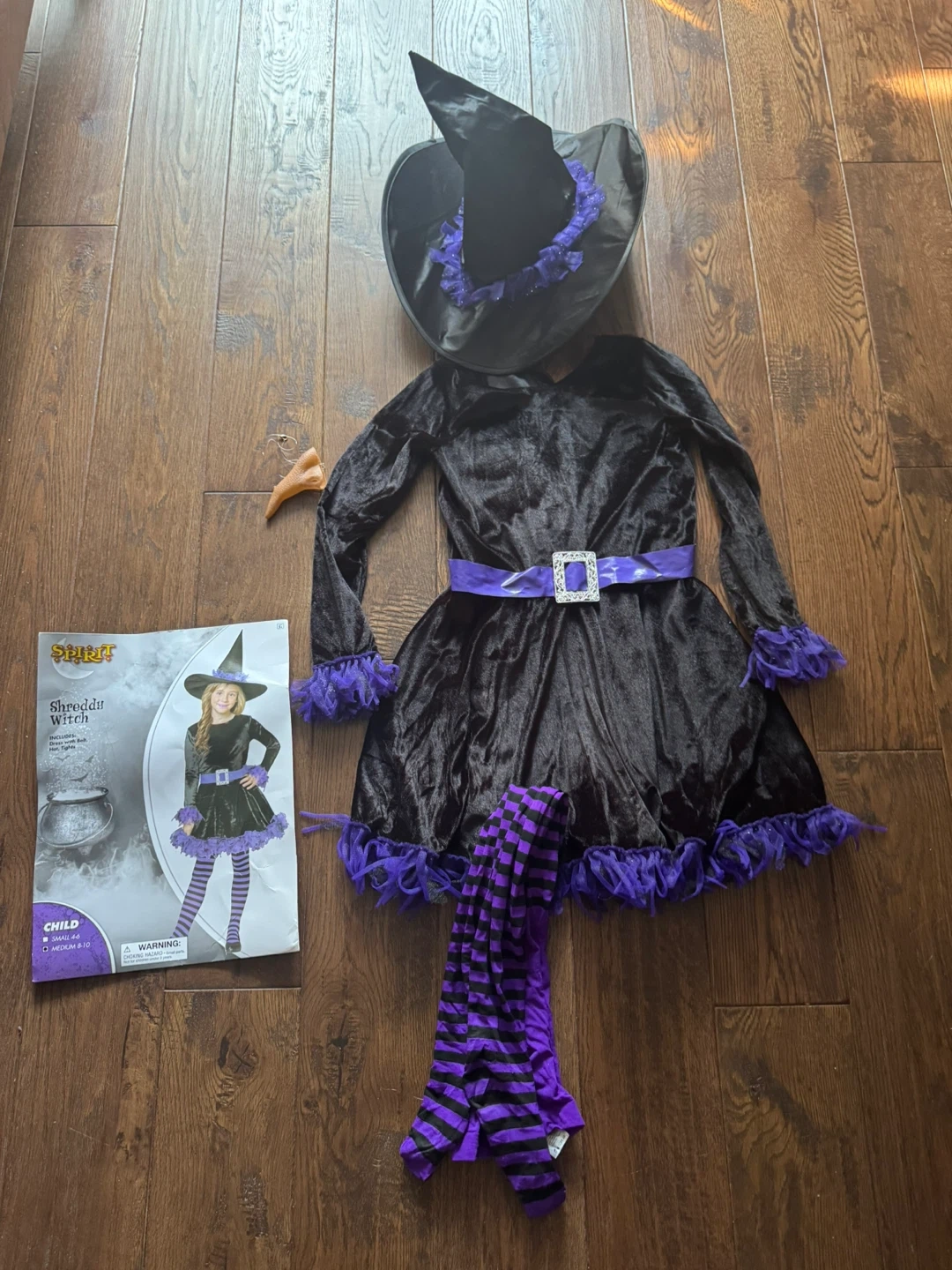 93Selling a Witch costume for kids! This is a child's size medium (8-10). Includes the dress with belt, hat, and tights. Perfect for Halloween or dress-up!