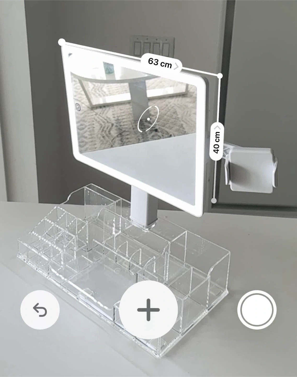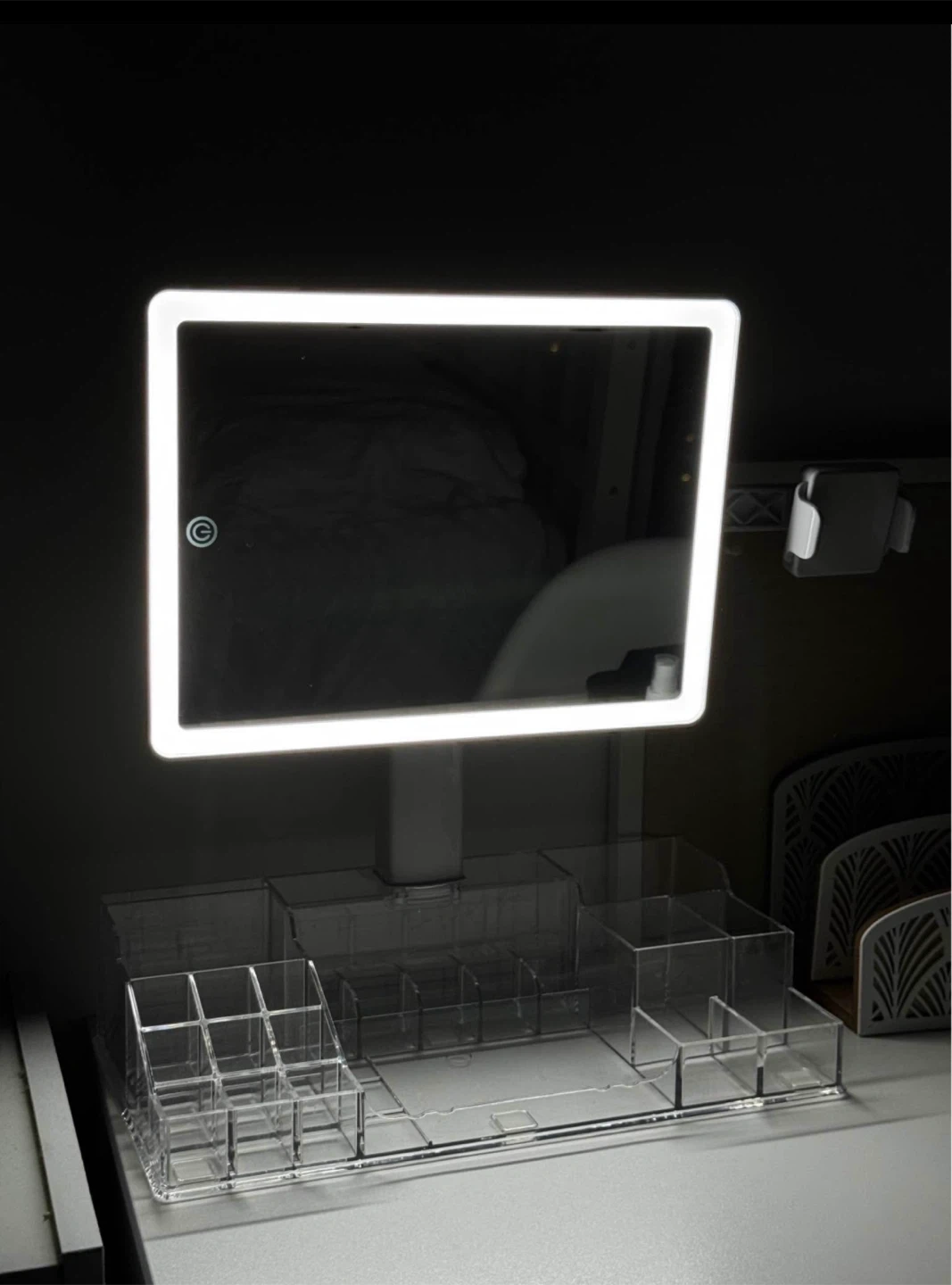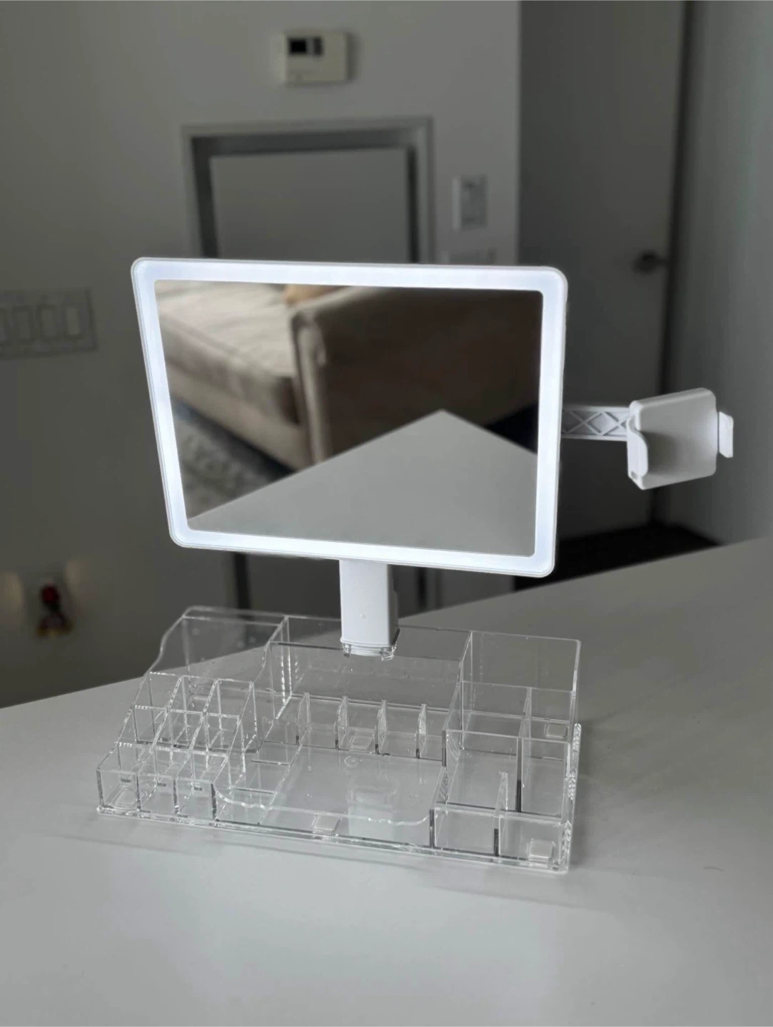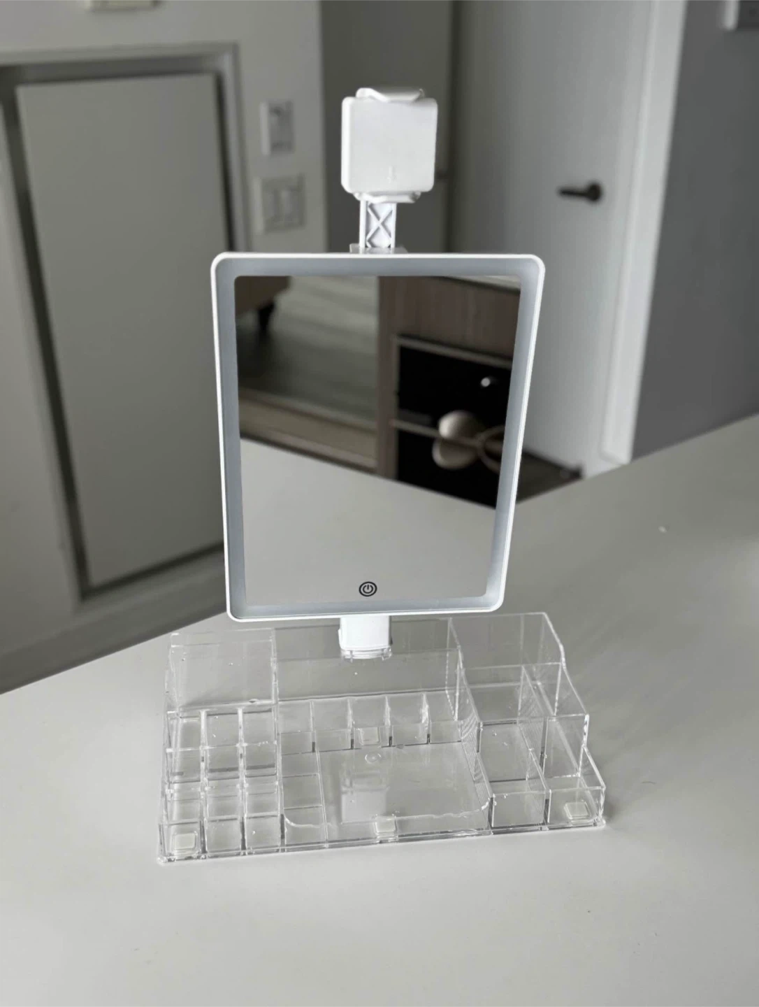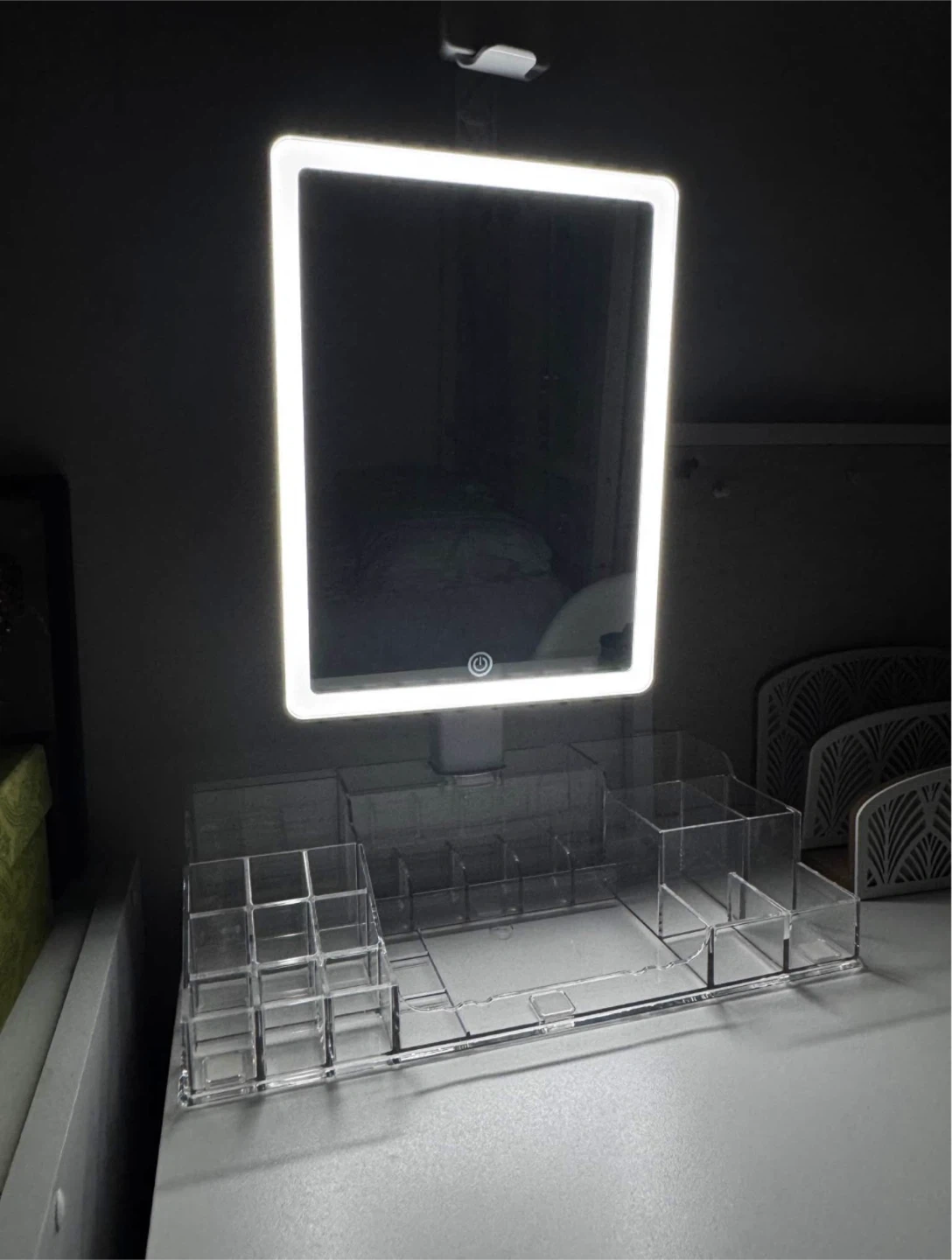 Selling a vanity mirror with LED lighting and a clear acrylic organizer. The mirror is 63cm wide and 40cm tall. Great for makeup or skincare!