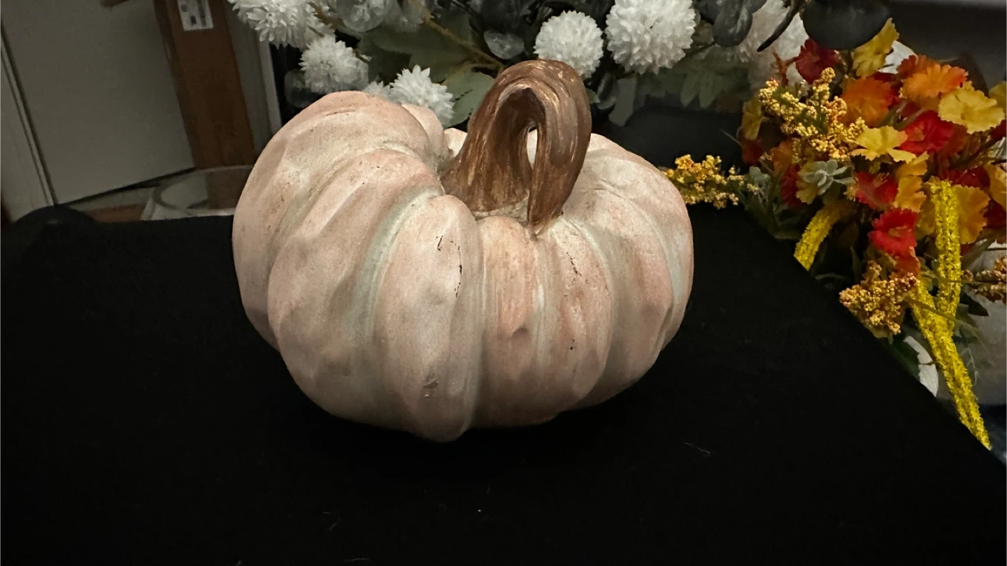 Decorative pumpkin, perfect for fall decor! It has a unique, slightly distressed look with a brown stem and a light pinkish-white body. Great for adding a touch of autumn to your home