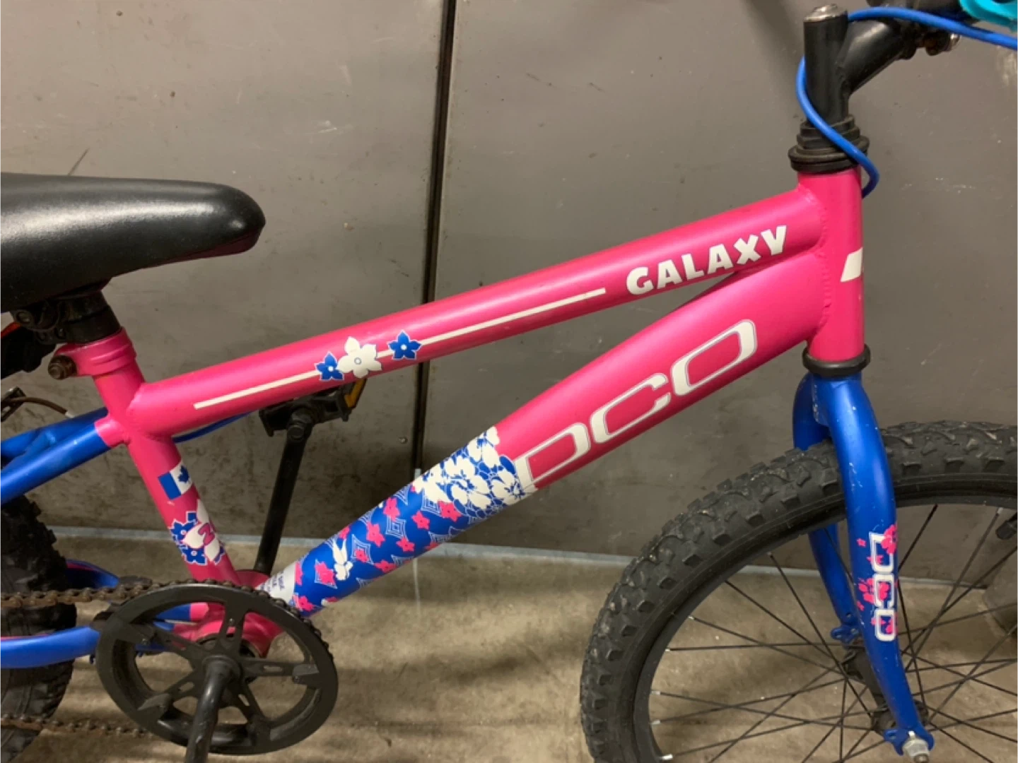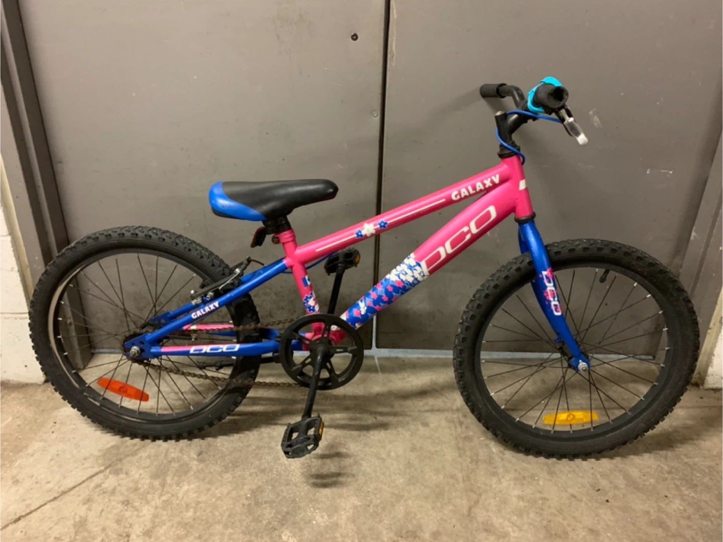 Selling a DCO Galaxy kids' bike in pink and blue! It's in great shape and ready for a new rider. Perfect for kids learning to ride or upgrading to a bigger bike. The bike has a sturdy frame and comfortable seat, making it a reliable choice for your little one's adventures