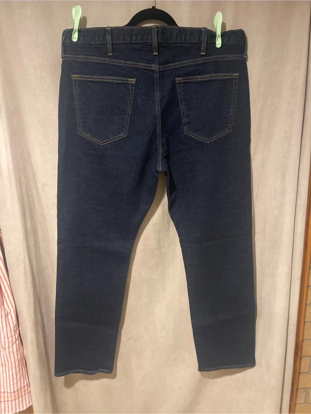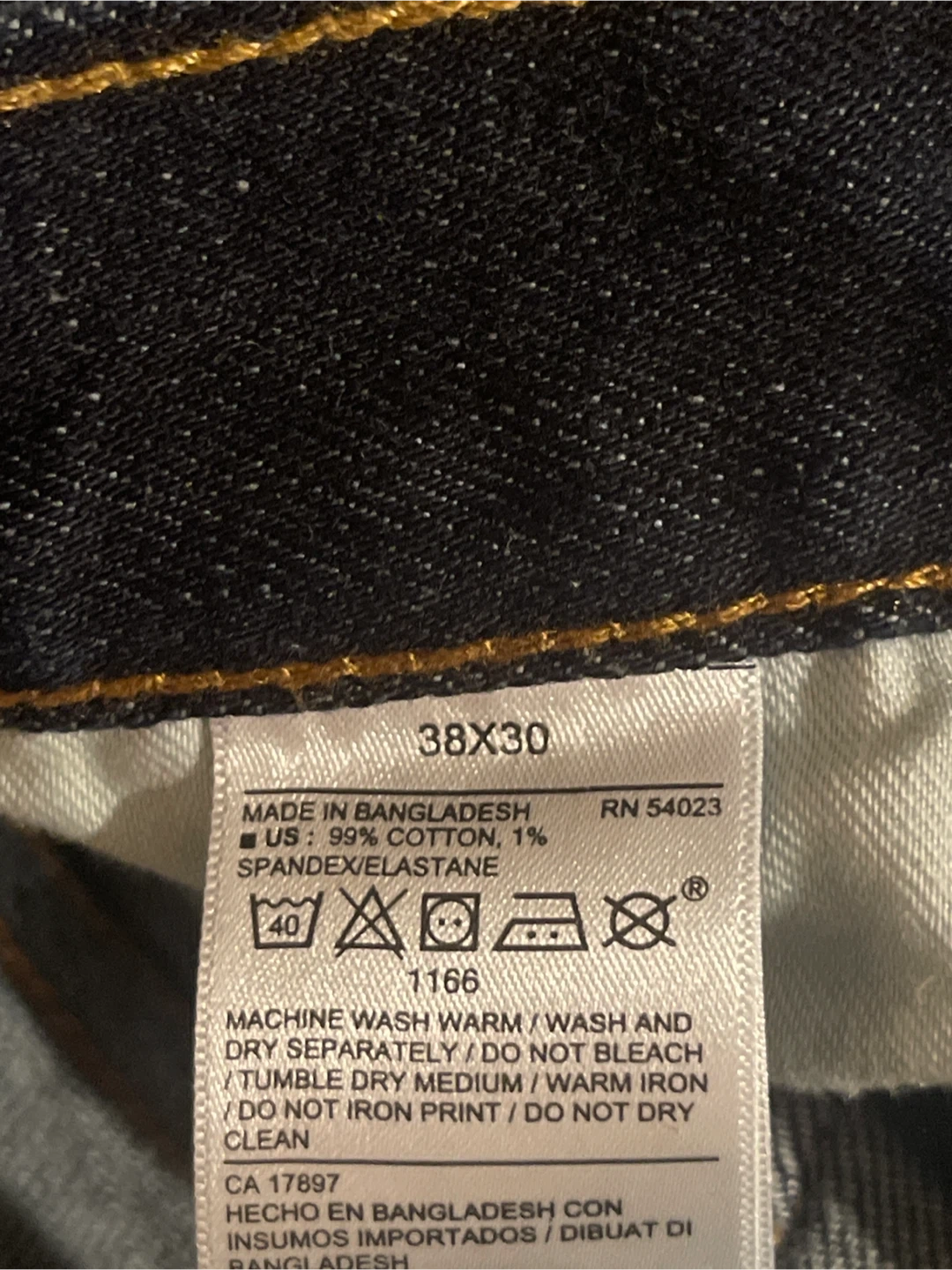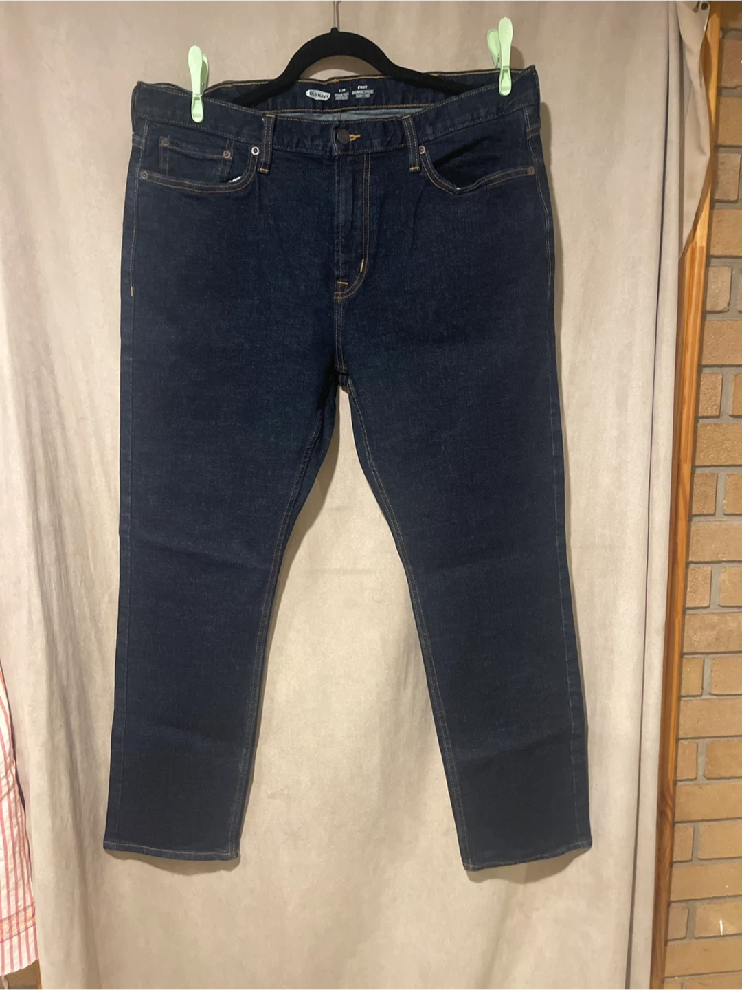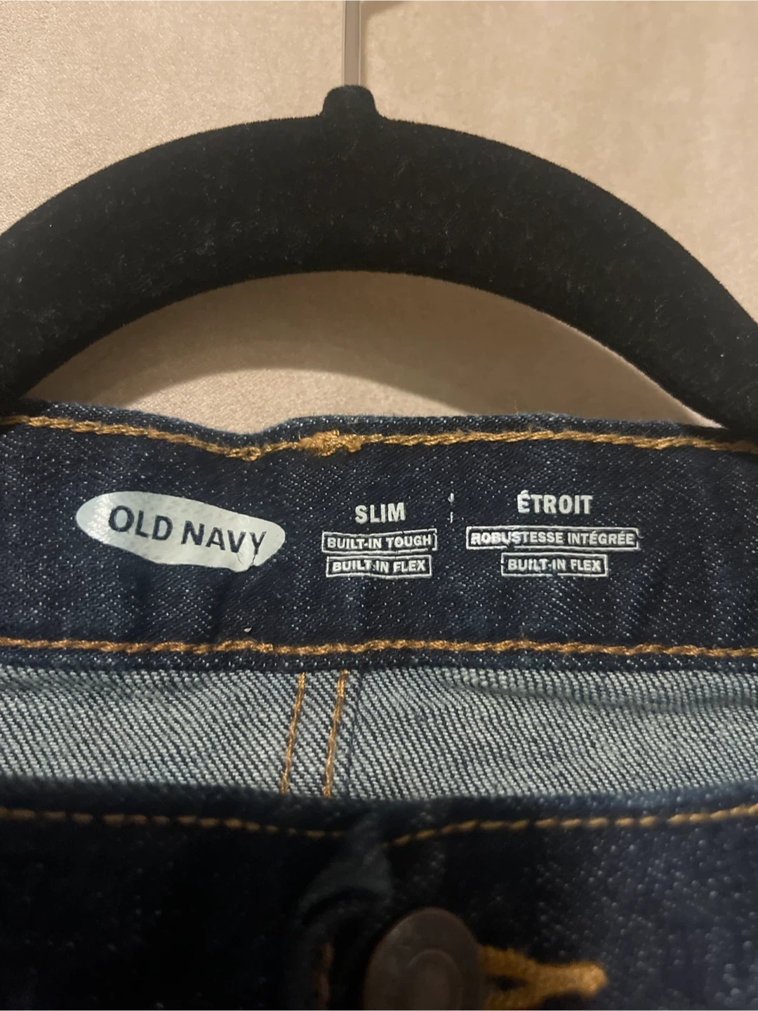 Selling a pair of Old Navy slim fit jeans. They are a size 38x30 and made with built-in flex for extra comfort. The material is 99% cotton and 1% spandex/elastane.