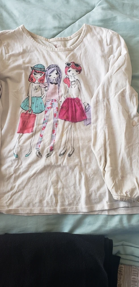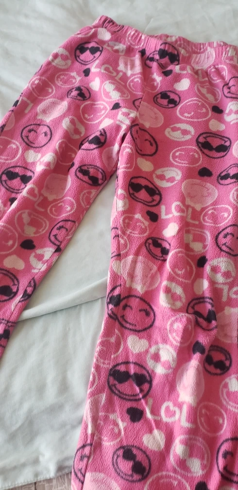 A long-sleeve top with a cute graphic of three girls. There are some stains on the sleeve. Also included are a pair of pink pajama pants with a fun smiley face pattern