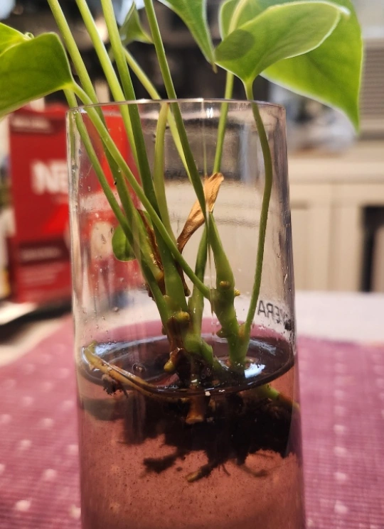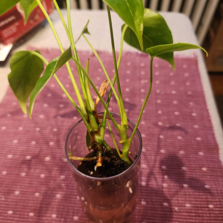 I'm selling two Anthurium plants in a plastic cup/vase. It's a lovely little plant that would look great on a desk or windowsill. It's currently in water, and the roots are developing nicely. It needs a vase and soil!