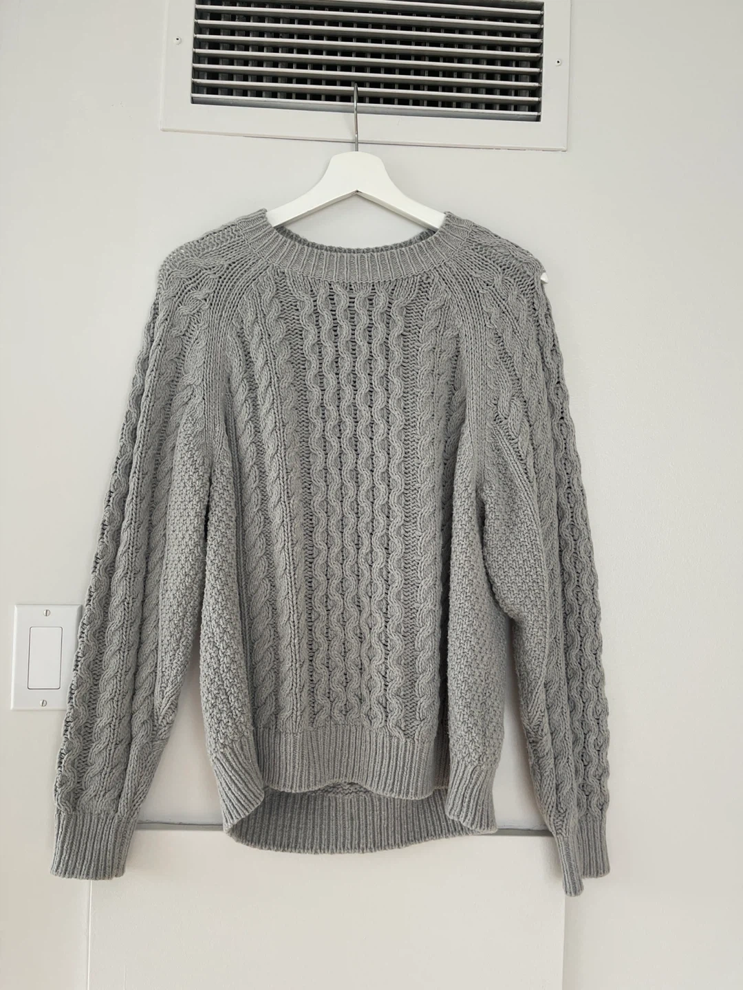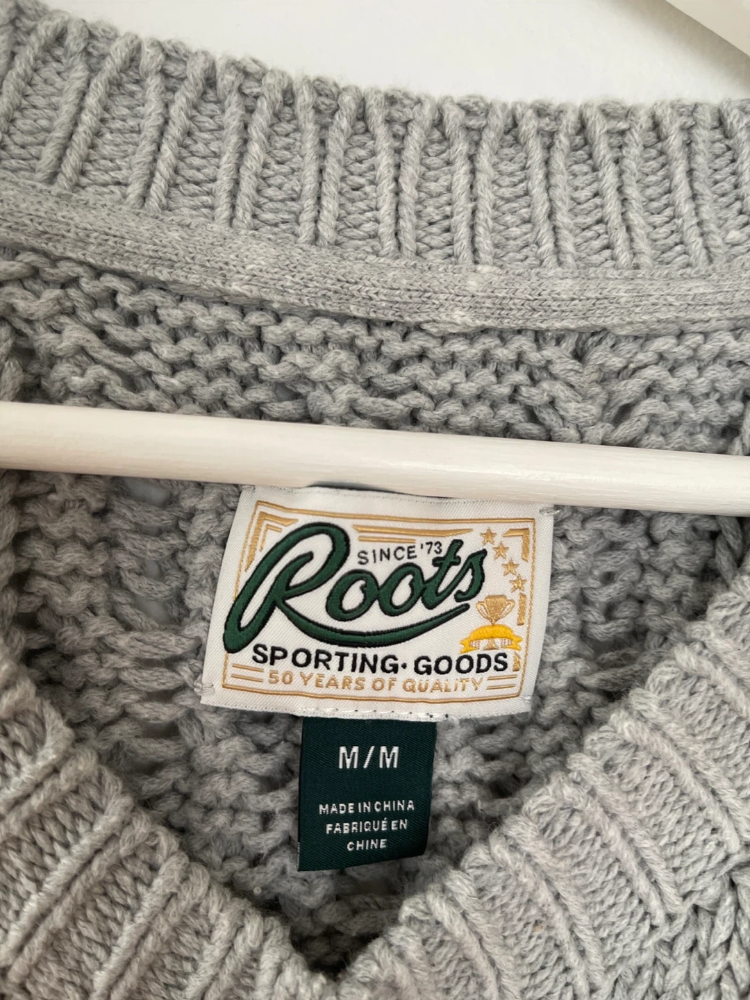 Cozy Roots Sporting Goods sweater for sale! This cable knit sweater is in a lovely grey colour and is marked as size M/M. Perfect for staying warm and stylish during the cooler months