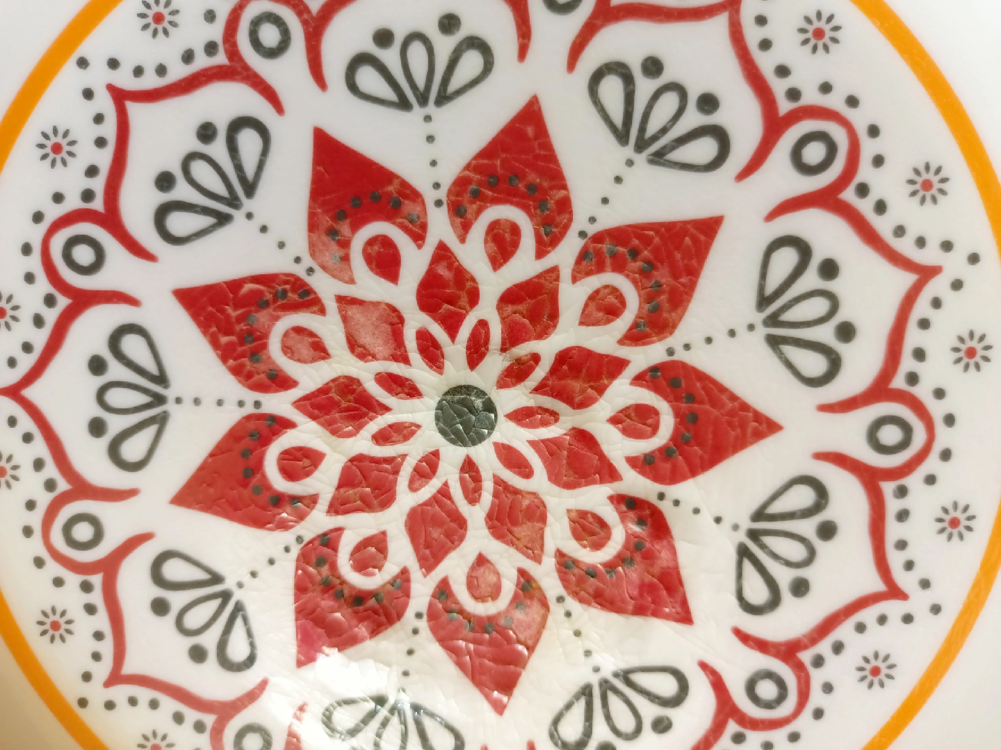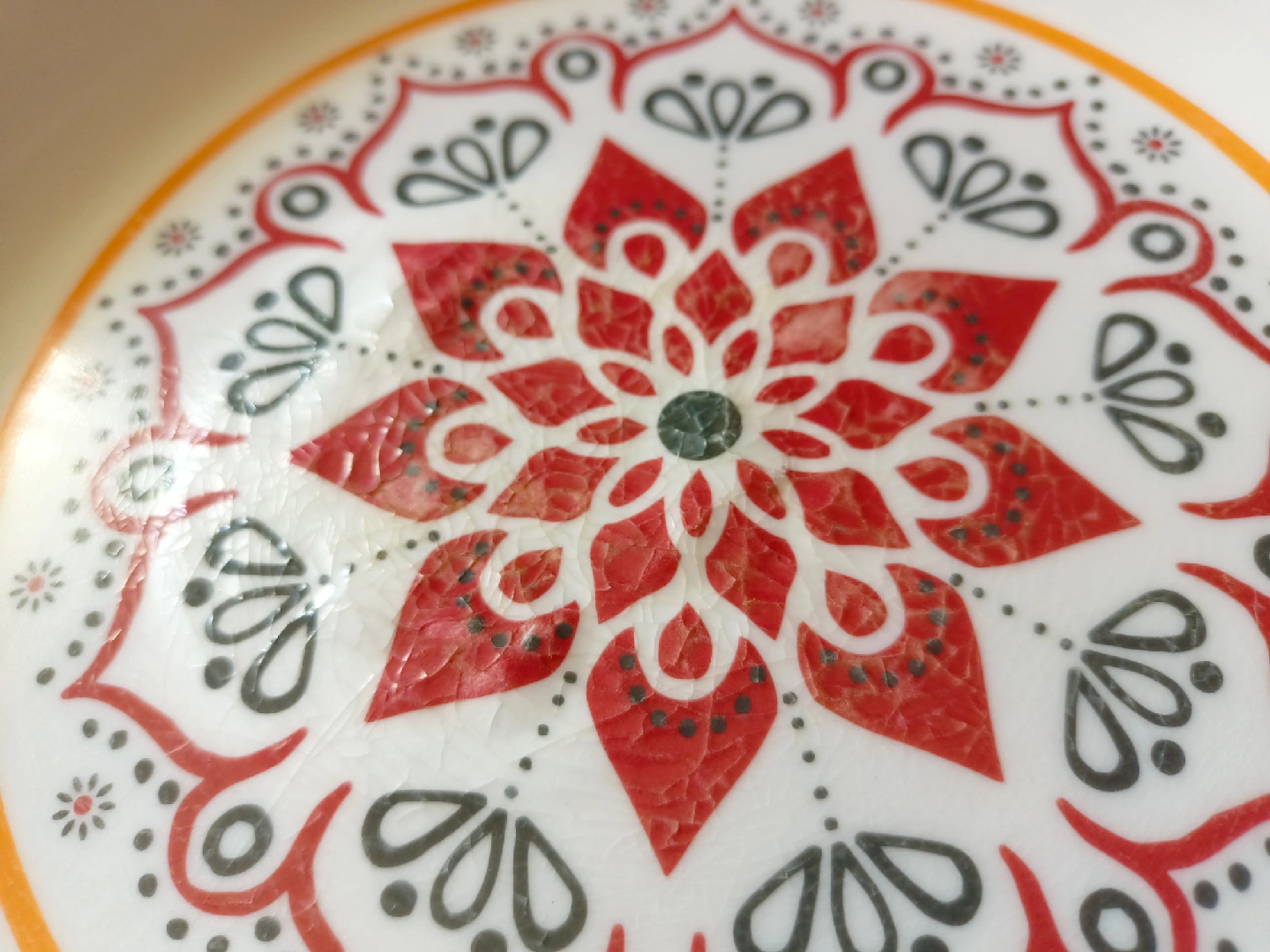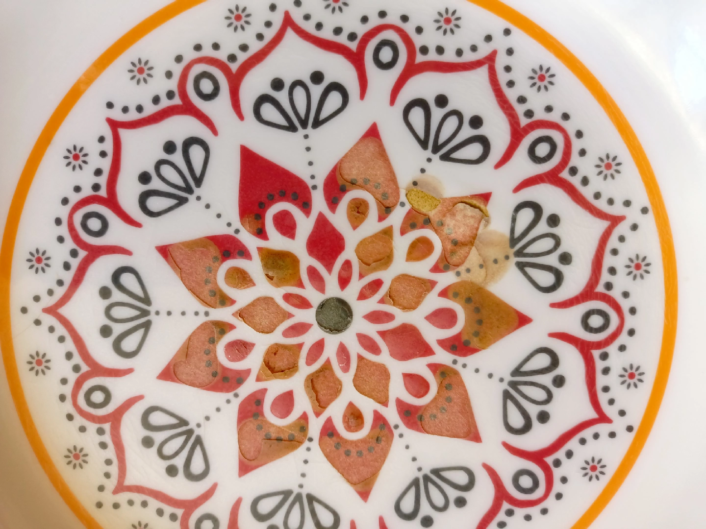 Selling a decorative bowl with a colorful design! It features an orange rim and a white center with a mandala-style pattern in red, black, and orange. Perfect for adding a pop of color to your kitchen or dining area.
