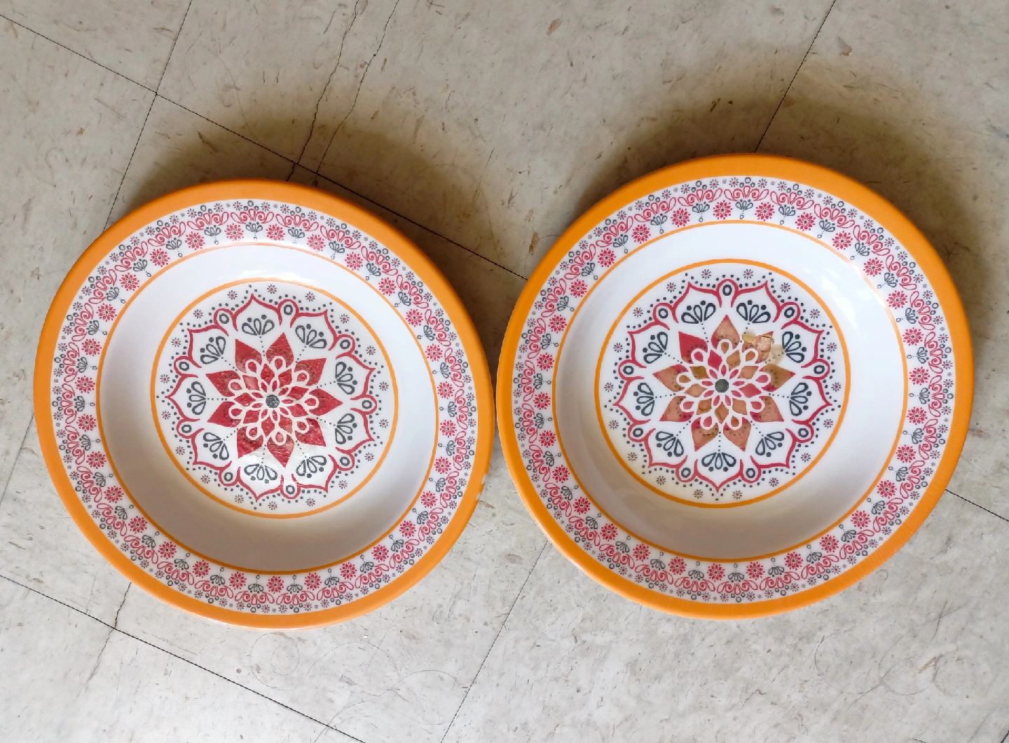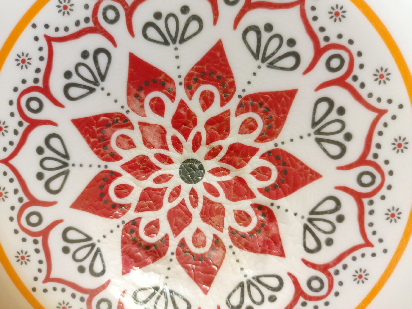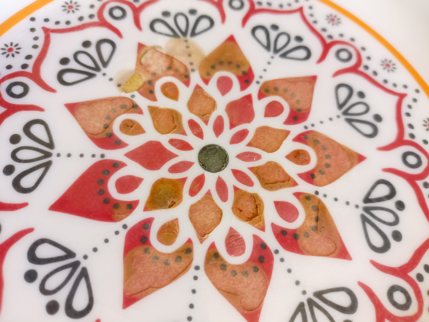 Selling a decorative bowl with a colorful design! It features an orange rim and a white center with a mandala-style pattern in red, black, and orange. Perfect for adding a pop of color to your kitchen or dining area.