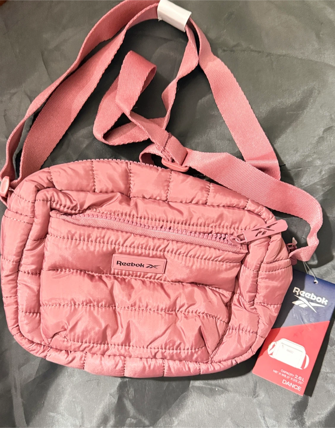 Brand new with tag Reebok crossbody bag up for grabs! It's a stylish pink colour with a quilted design. Perfect for carrying your essentials while keeping your hands free. The tag indicates a capacity of 2.6L and dimensions of H6" x W8.5" x D3.25".