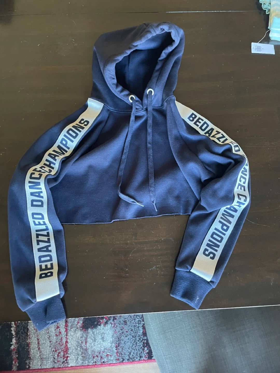 Selling a cute navy blue cropped hoodie with "Bedazzled Dance Champions" printed on the sleeves! It's in great condition and perfect for dance practice or casual wear