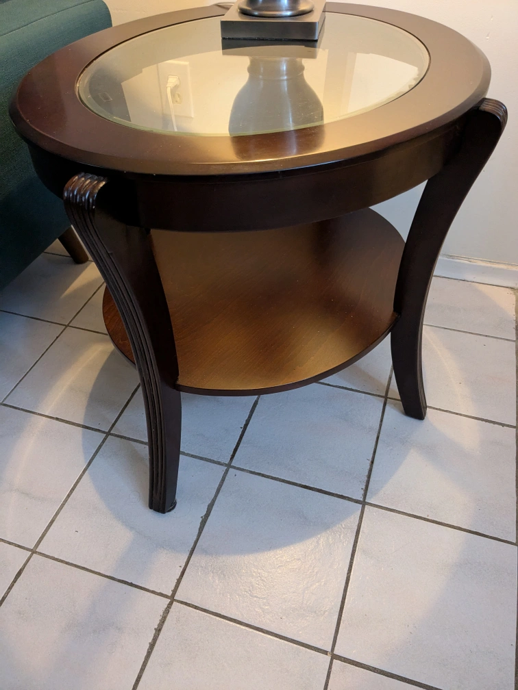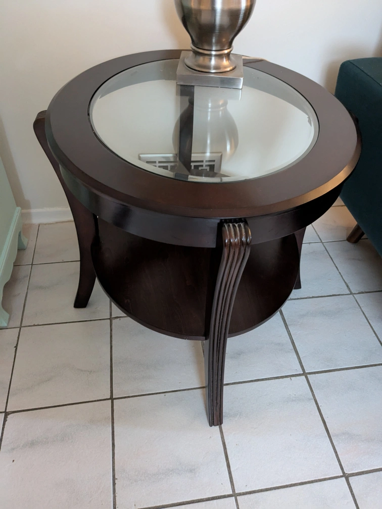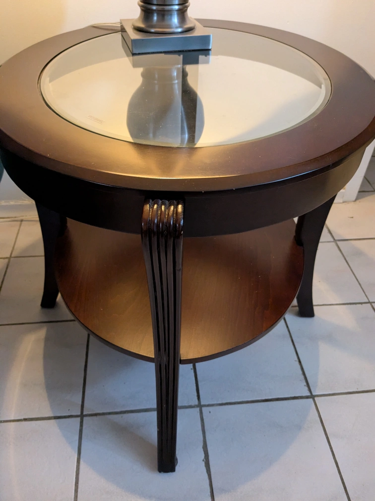 Selling a lovely round end table! It features a glass top and a dark wood finish. It's in great shape and would look perfect next to a sofa or armchair. A stylish addition to any living room! I have 2of this table and 1 coffee table match with it. The list price is only for one table, if you interested with all, please send me message. Cash only,pick up only,no delivery.