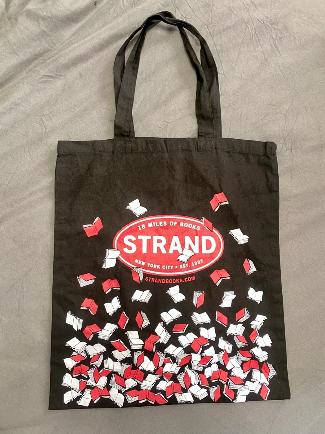 Selling a black Strand Bookstore tote bag! It features the classic '18 Miles of Books' logo with falling books design. Great for carrying books or groceries. Sells new online for $25!