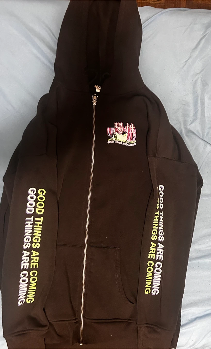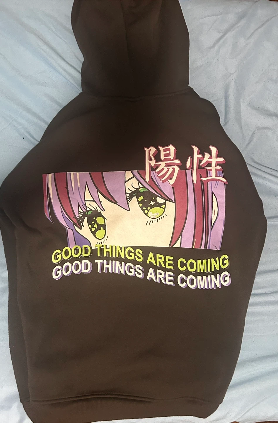Selling a cool anime graphic zip-up hoodie! It's a dark brown colour with the text "Good Things Are Coming" printed on the sleeves and back. The hoodie also features a unique anime character graphic. Perfect for anyone who loves anime or wants to add a unique piece to their wardrobe