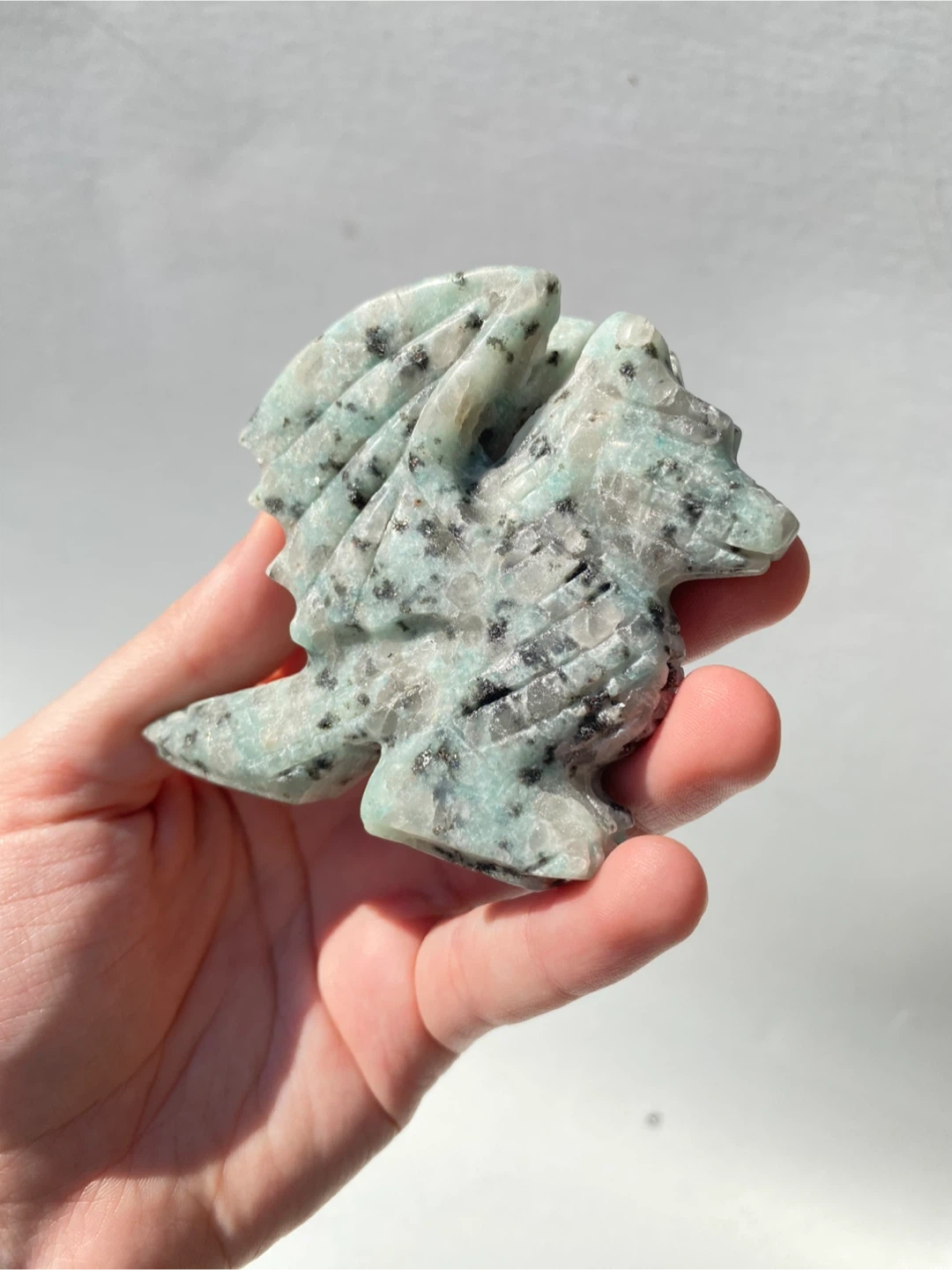 Super cute hand carved crystal! natural kiwi jasper with so many dragon details carved on Approximately 2.75” tall and 149g You will receive exact item shown Lifts the spirit, removes negative emotions, and offers us strength and support.