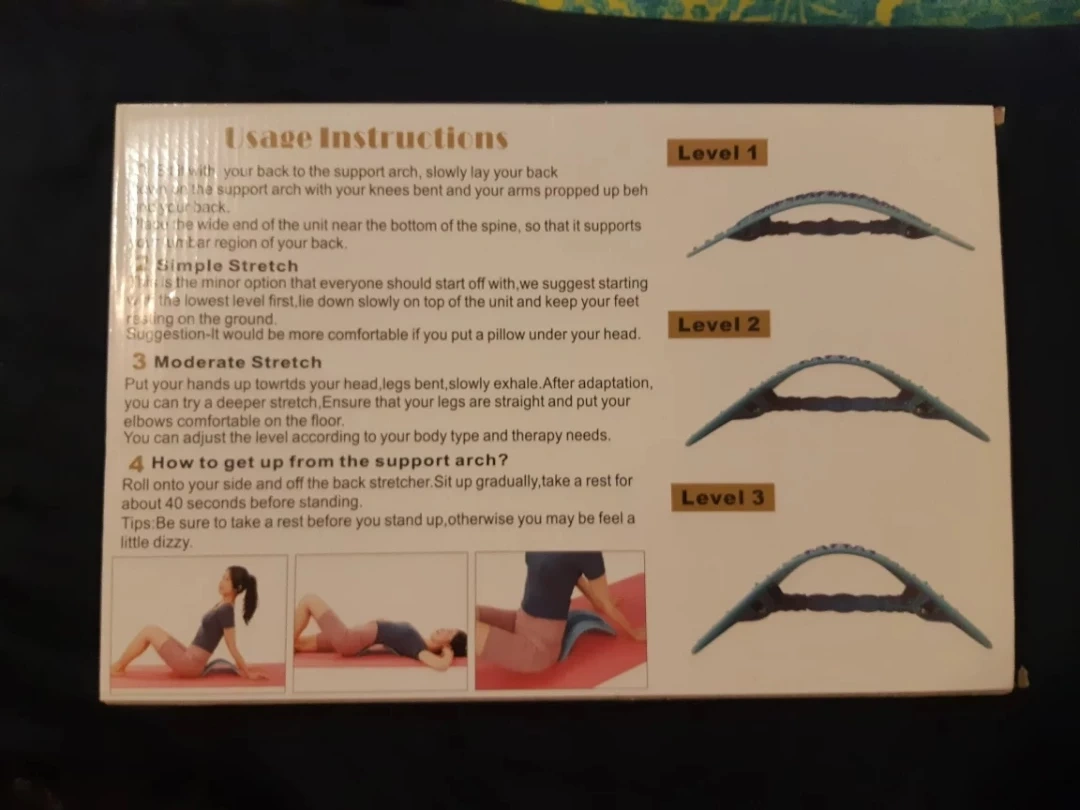 Get ready to relax with this Waist Relax Mate! It's designed for soothing and massage, helping you feel good. The box includes usage instructions with different levels for your comfort. Enjoy a simple or moderate stretch, and follow the instructions on how to get up from the support arch. Take a rest for about 40 seconds before standing for the best experience