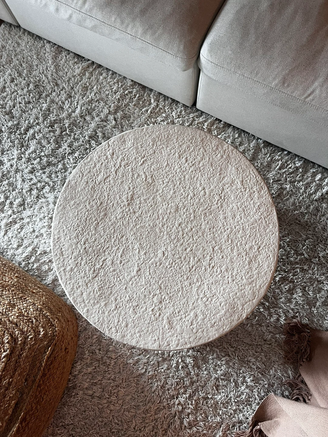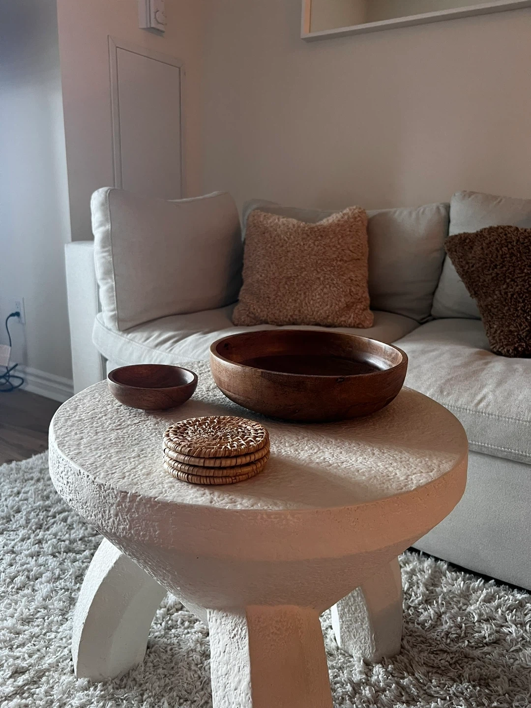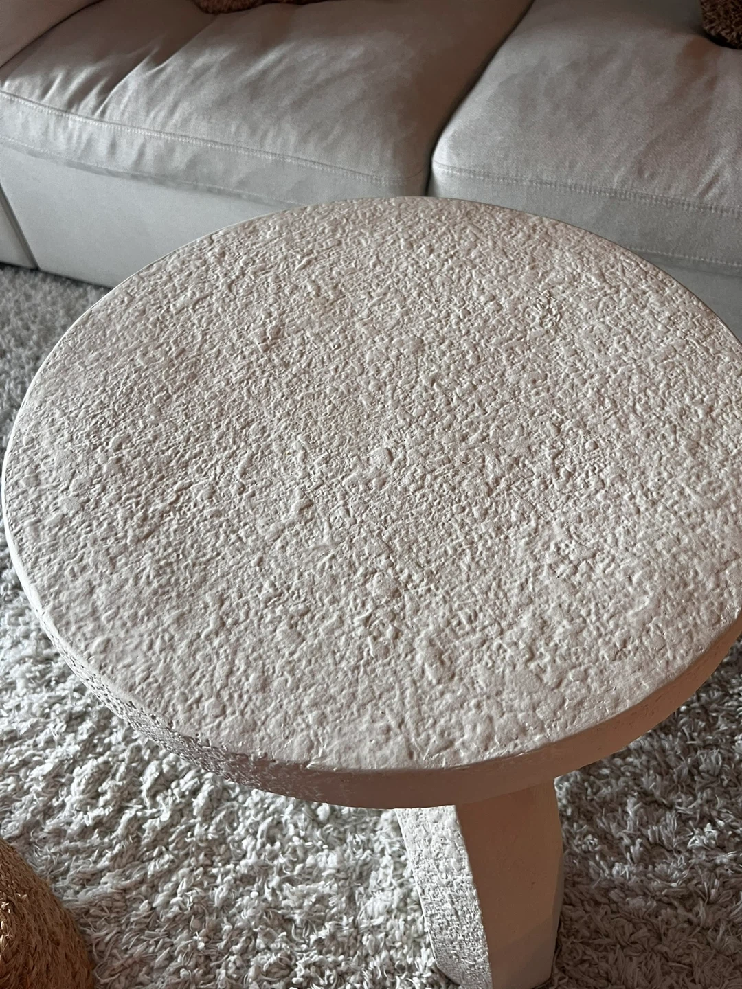 Selling a textured white round accent table from Crate and Barrel. It's in great condition and would be perfect for adding a unique touch to your living space or bedroom! It's very sturdy and stylish, ready to find a new home. Comes with the wooden bowls from Zara Home and the coasters from Crate and Barrel. Dimensions ๐ Height: 19 inches Price is firm. Thank you! Cash only.
