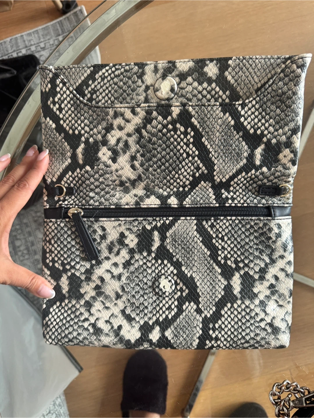 Selling a stylish snakeskin print clutch. It's in great condition and perfect for a night out or special occasion. The clutch features a snap closure and a zippered compartment for added security. It's a beautiful accessory to complete your look
