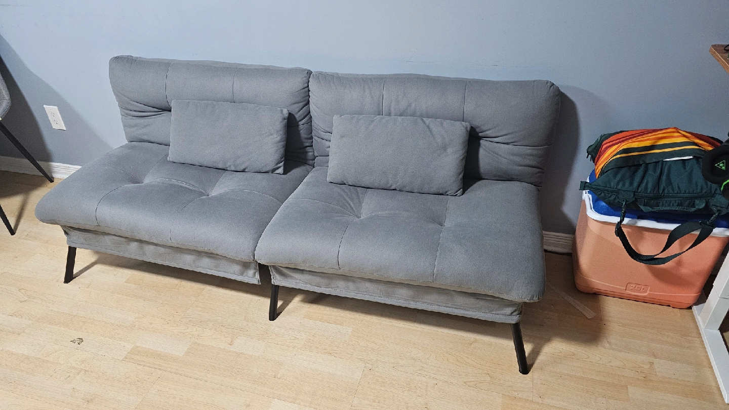 Selling a comfy COMHOMA futon sofa bed. It's in excellent condition and comes with two matching pillows. Perfect for a tighter space but opens up if you want to take a nap!