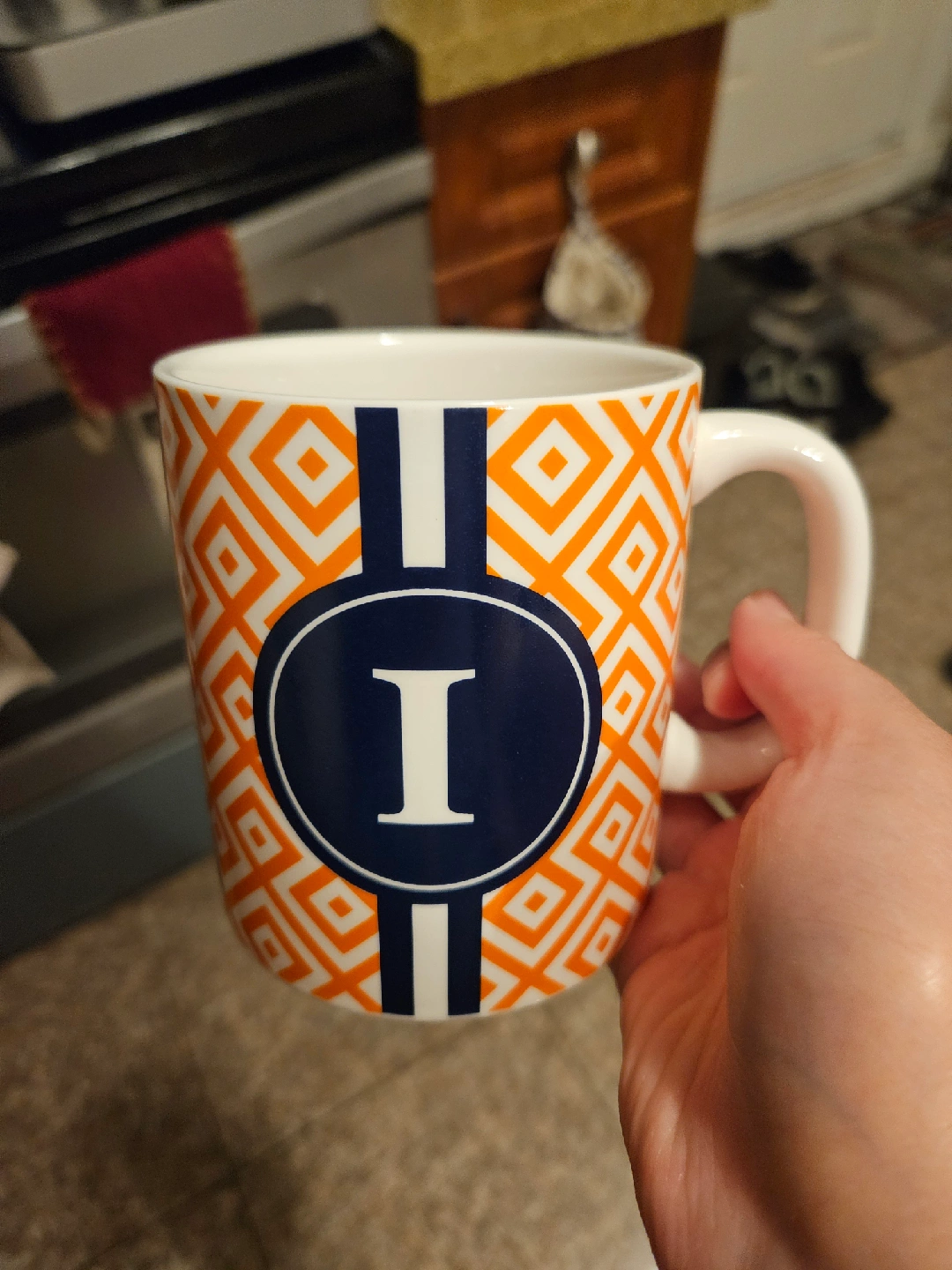 A cute mug featuring an orange and white geometric pattern with a navy blue circle and the letter 'I' in the centre. Perfect for your morning coffee or tea!