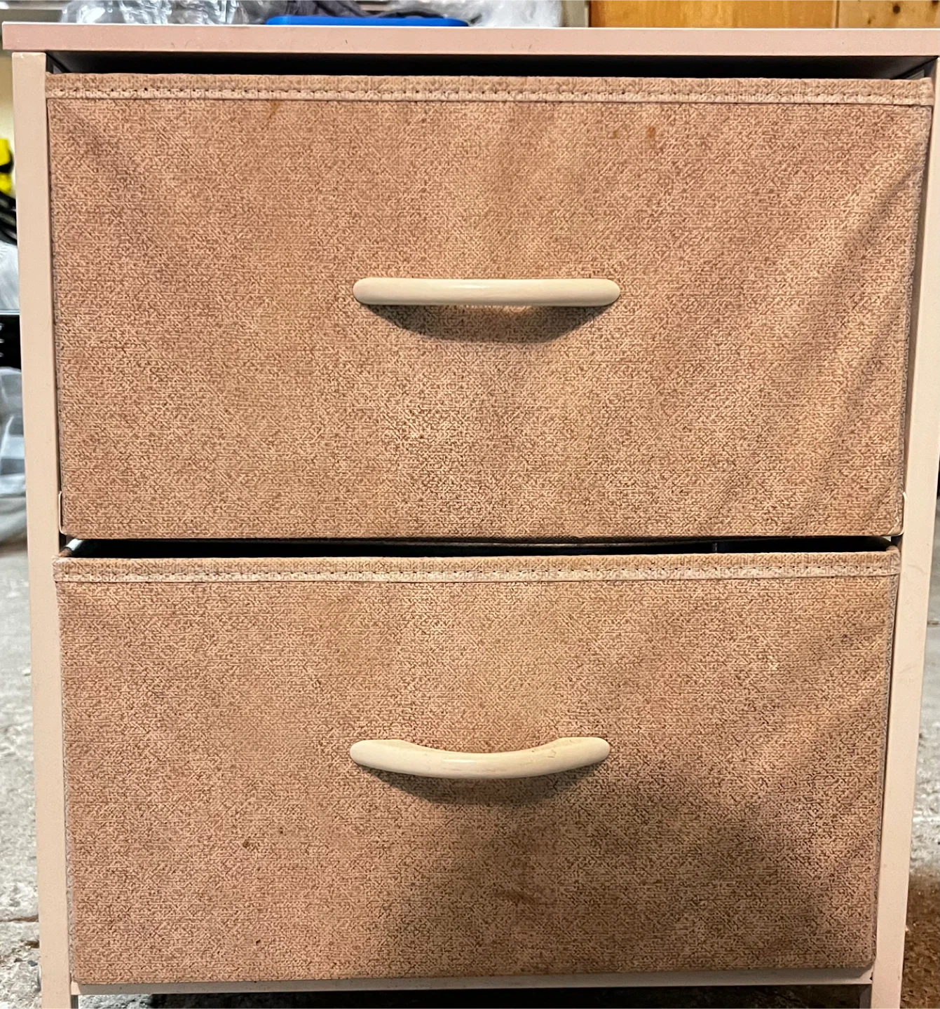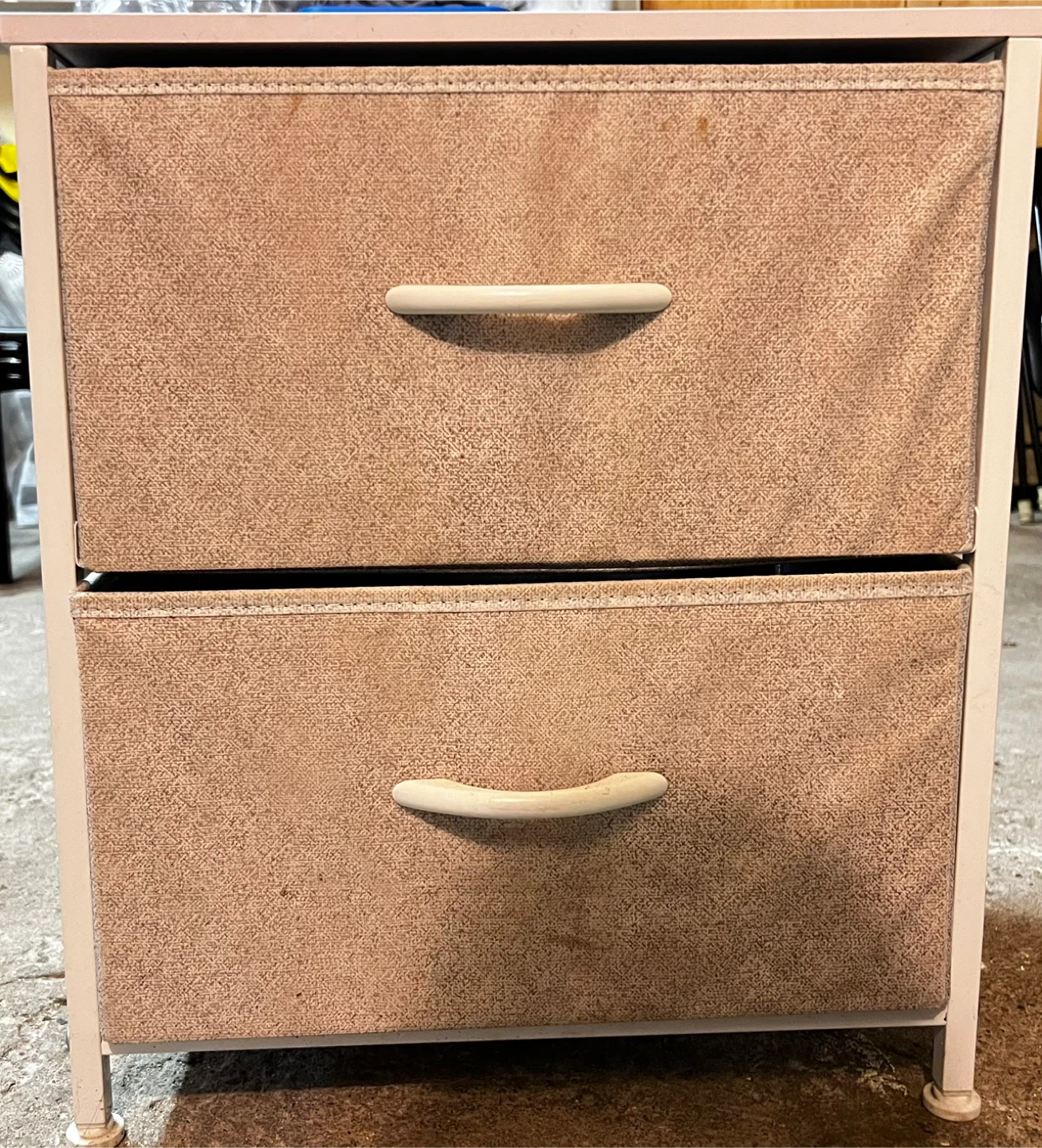 Here's a handy two-drawer storage unit! It's perfect for organizing your space. The drawers are made of a textured fabric, and the frame is a sturdy metal. It's a great addition to any room!π₯