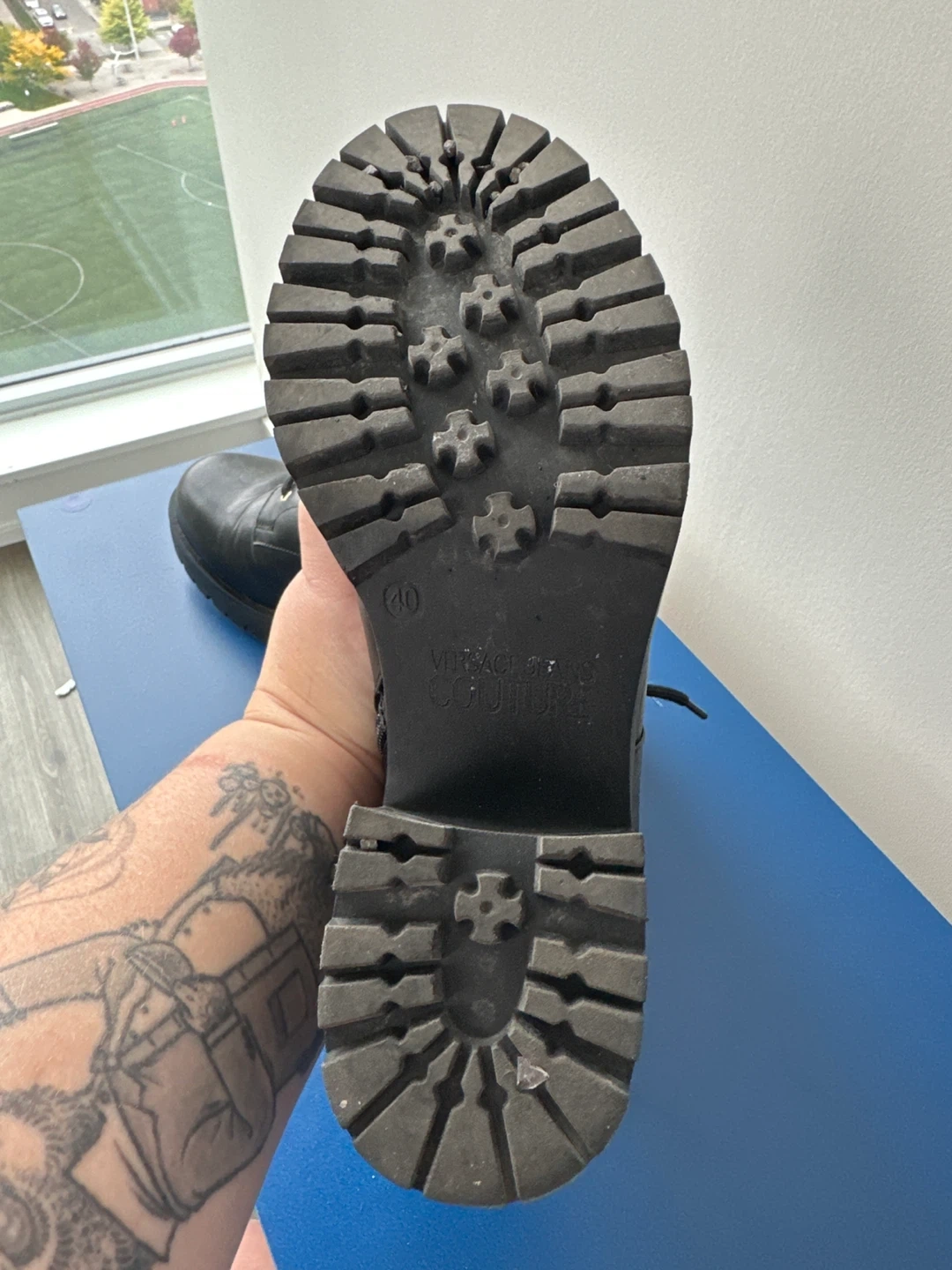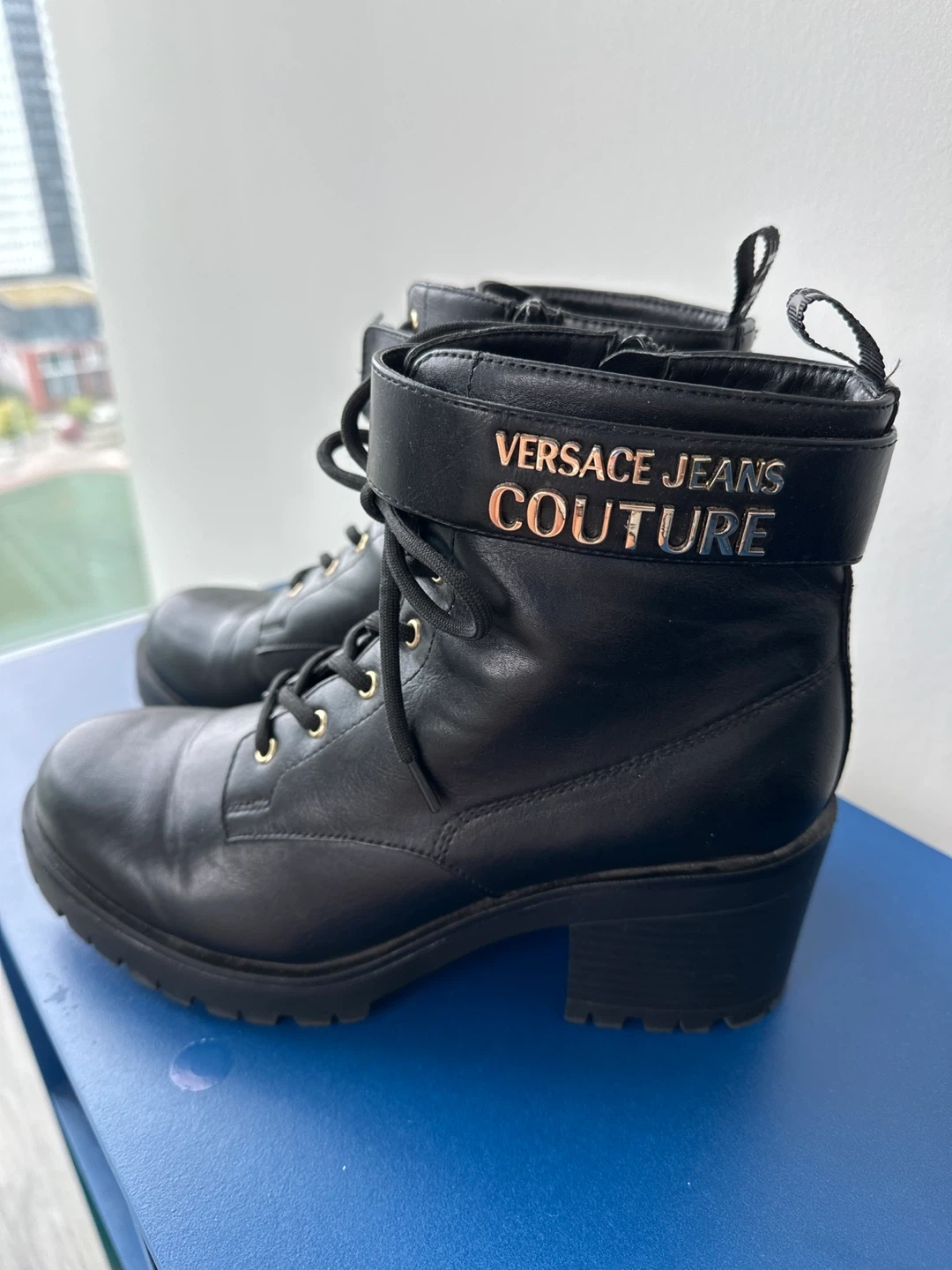 Selling a pair of Versace Jeans Couture black boots. They are a size 40 but fits well in a 38. The boots have a heel and a lace-up design.