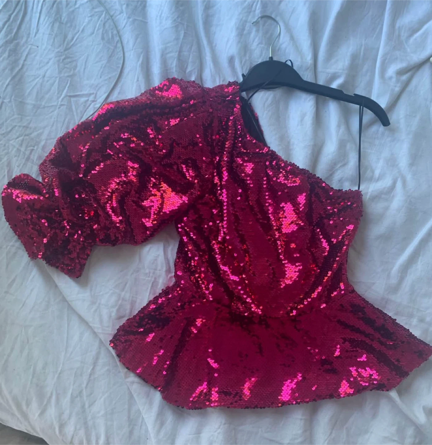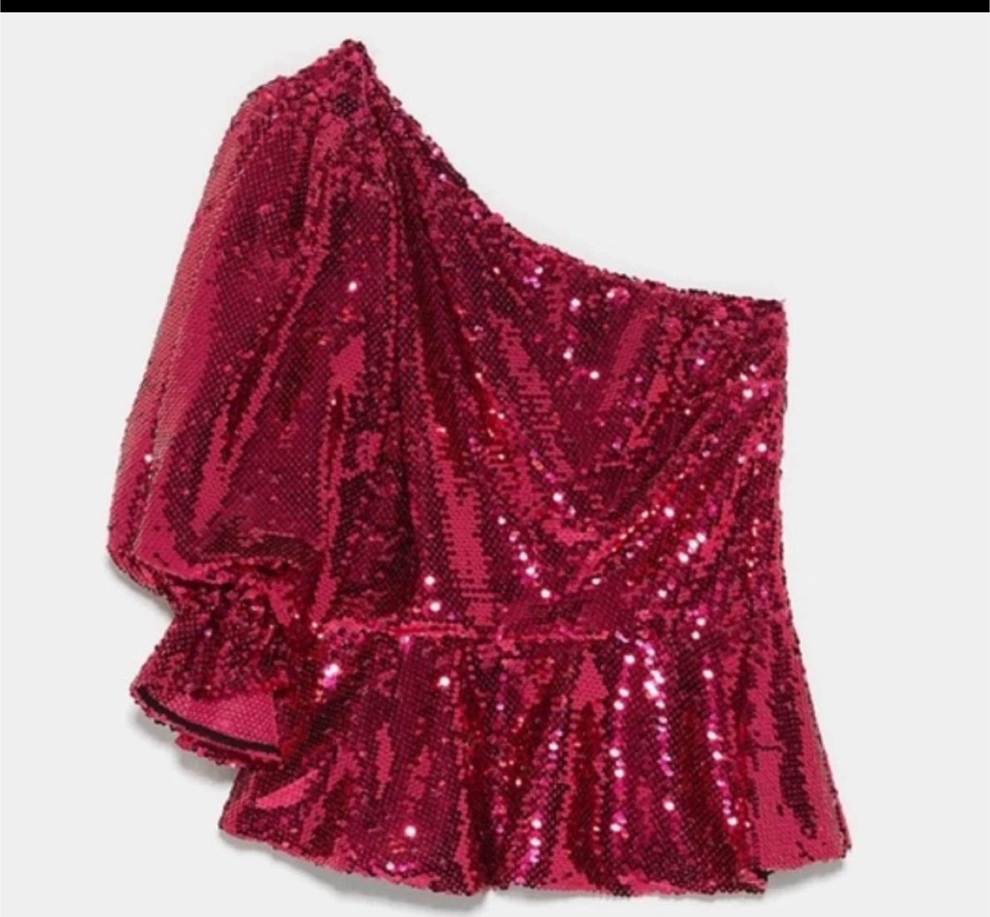 Check out this sequin one-shoulder top! It's a size small and features a fun, sparkly design. Perfect for a night out or a special occasion. The vibrant colour is sure to make a statement!