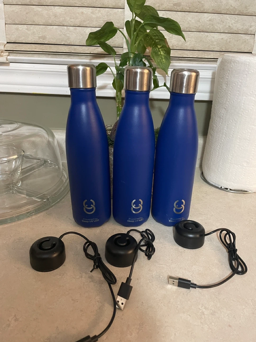 Selling three CrazyCap Deep UV LED water bottles in blue! They come with their charging bases. These bottles are designed to purify water using UV light, so they're great for travel or everyday use. They are lightweight and portable. Bottoms slightly dented so it rocks but still stands.