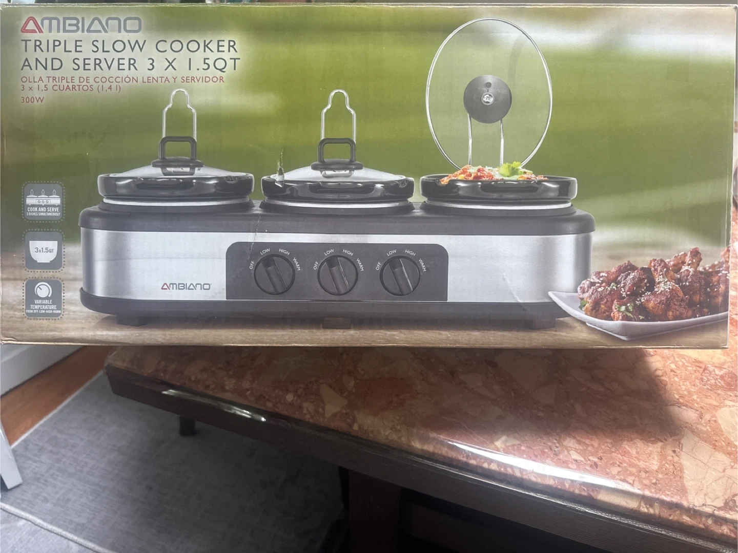 Selling an Ambiano triple slow cooker and server. It has three 1.5 quart capacity dishes, perfect for cooking and serving different dishes simultaneously! It features variable temperature settings (low, high, warm).