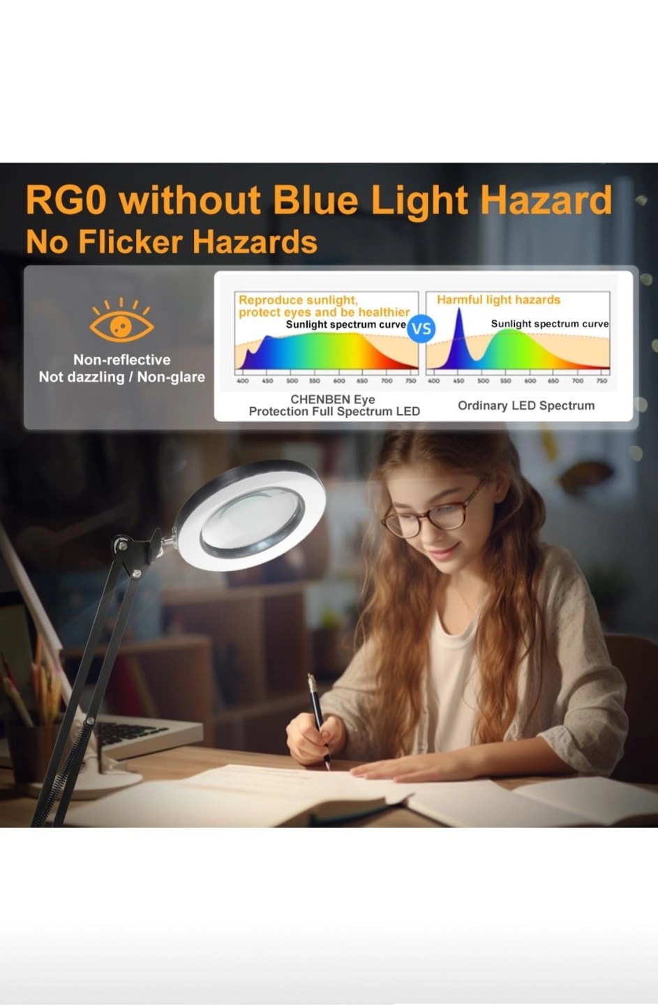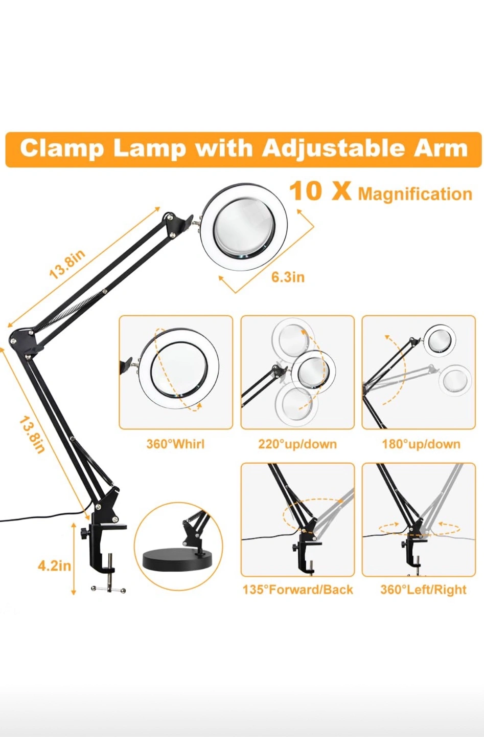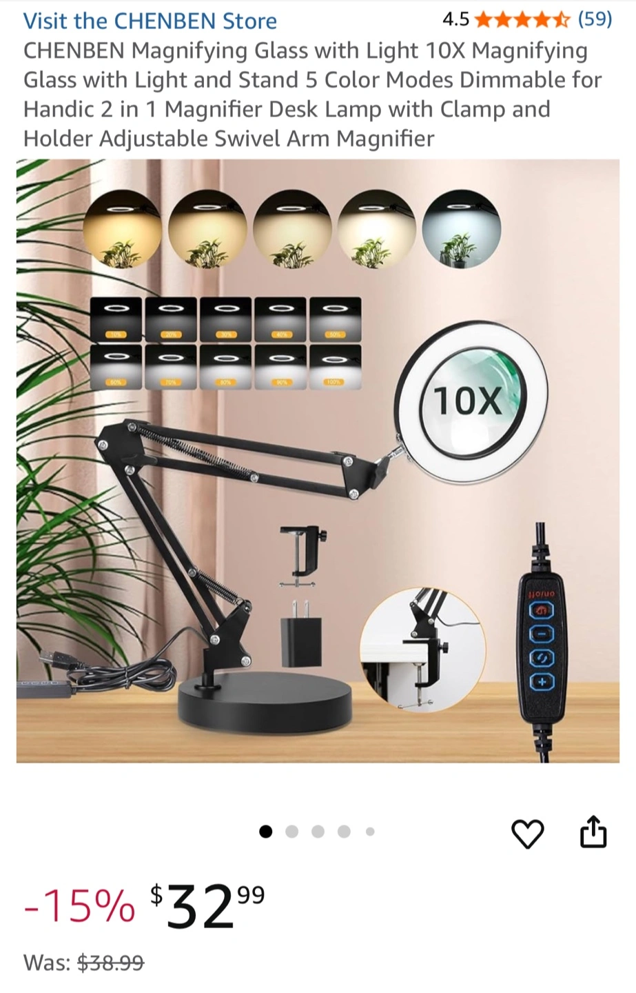 a CHENBEN magnifying glass with light. It has 10X magnification for higher definition. It features 5 color light modes and is dimmable. It also has a clamp and holder with an adjustable swivel arm. Originally bought for $32.99