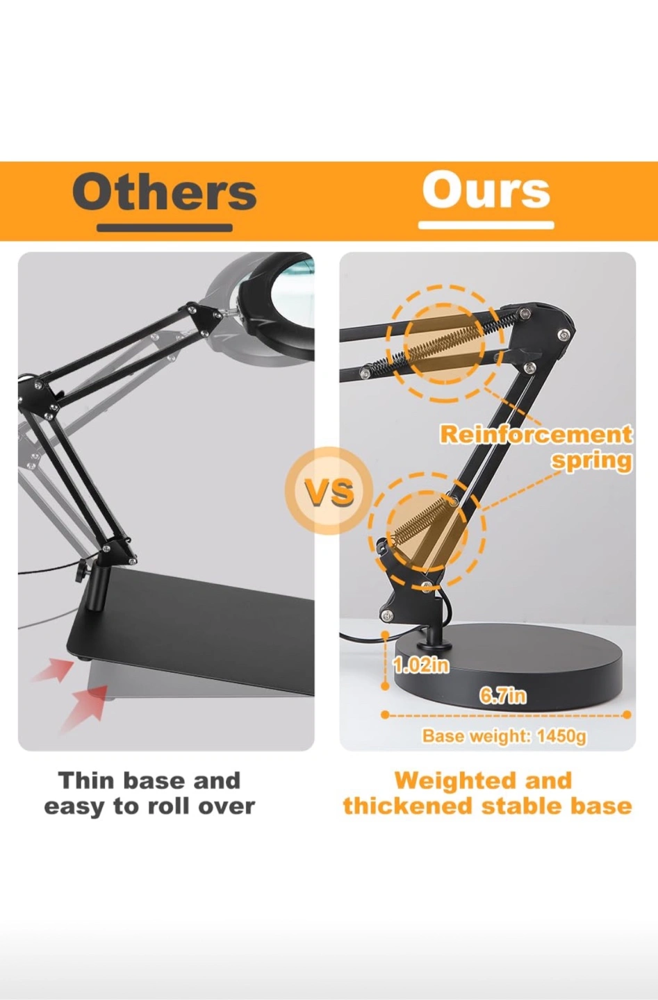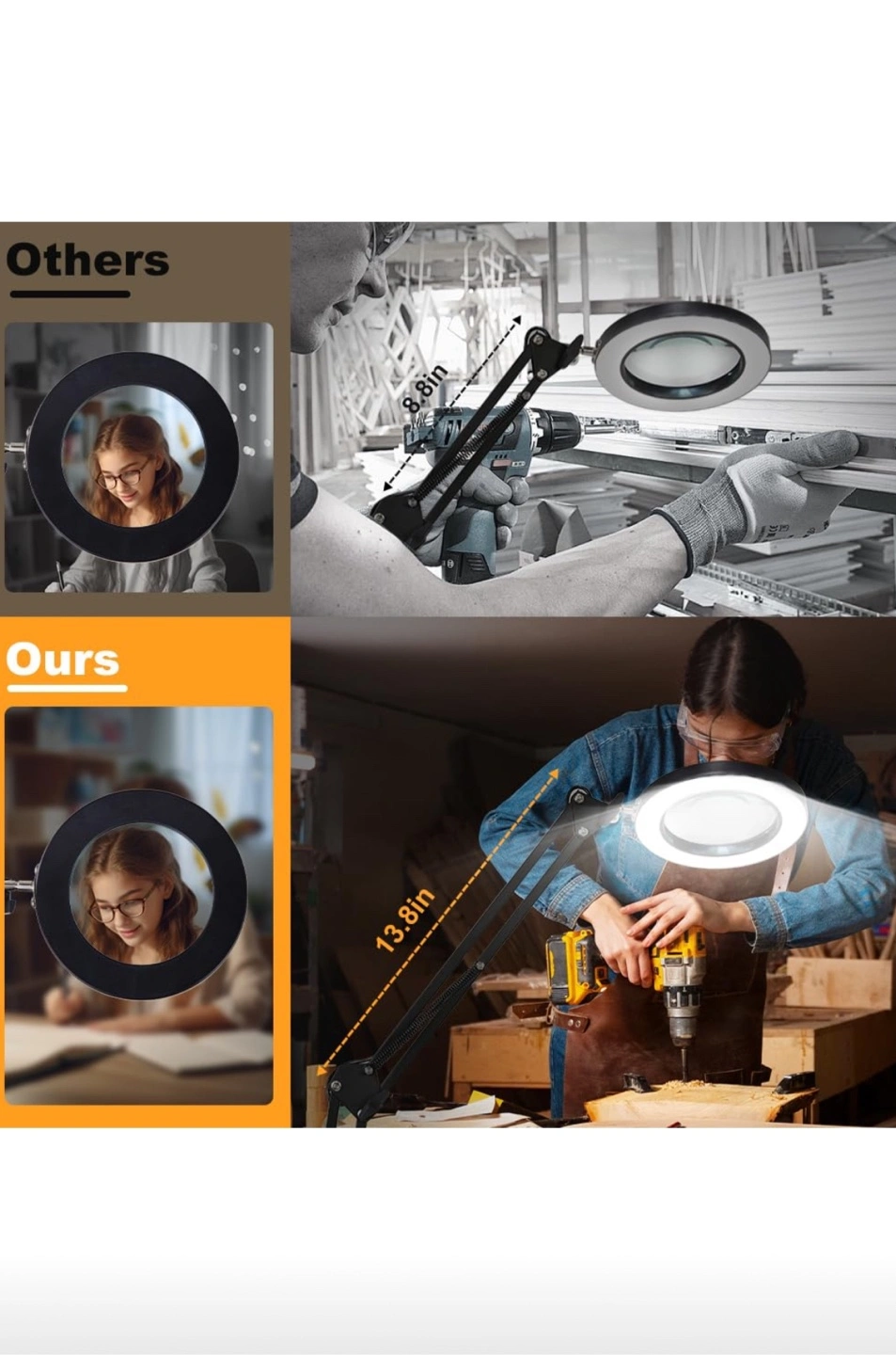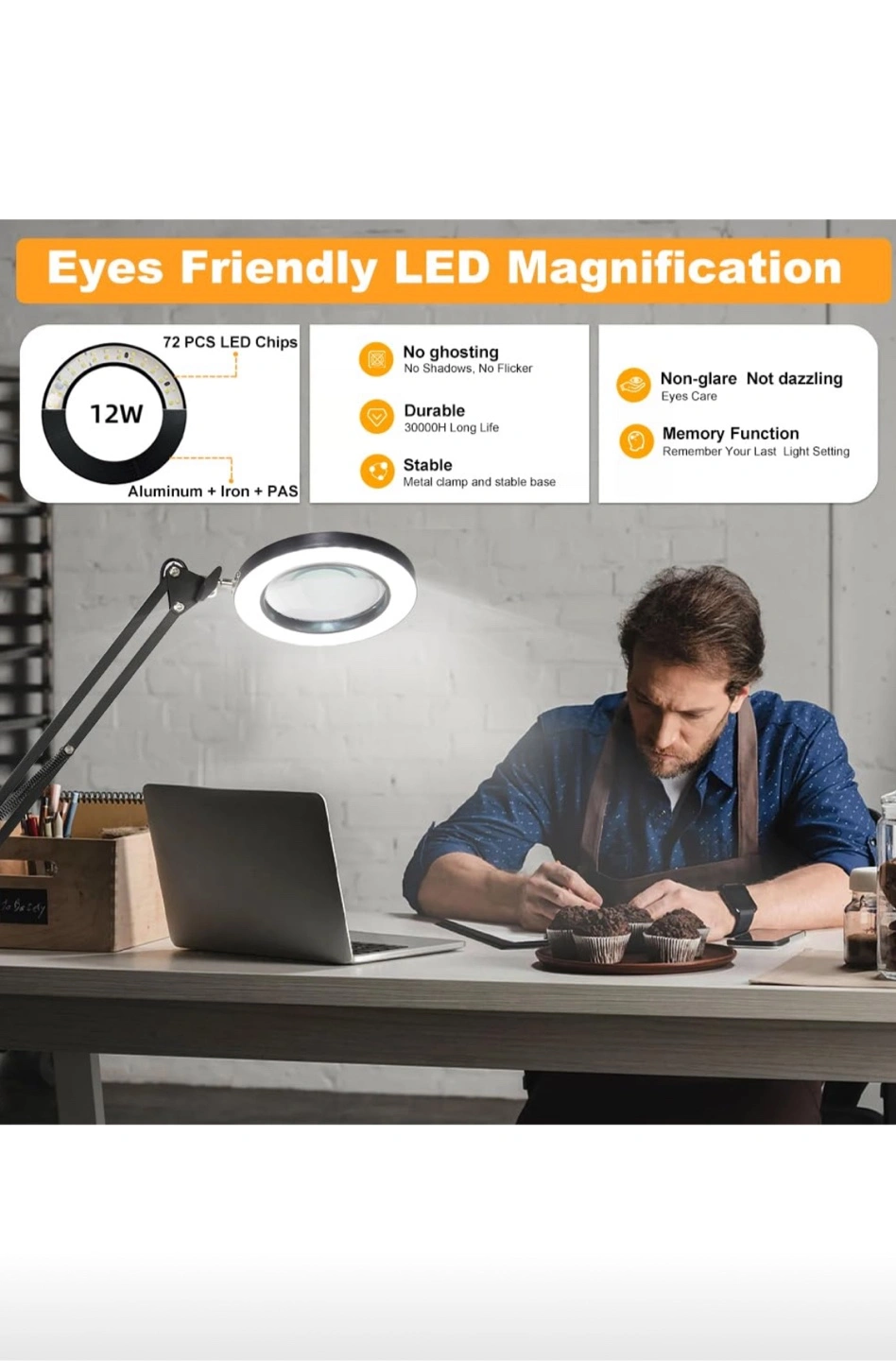 a CHENBEN magnifying glass with light. It has 10X magnification for higher definition. It features 5 color light modes and is dimmable. It also has a clamp and holder with an adjustable swivel arm. Originally bought for $32.99