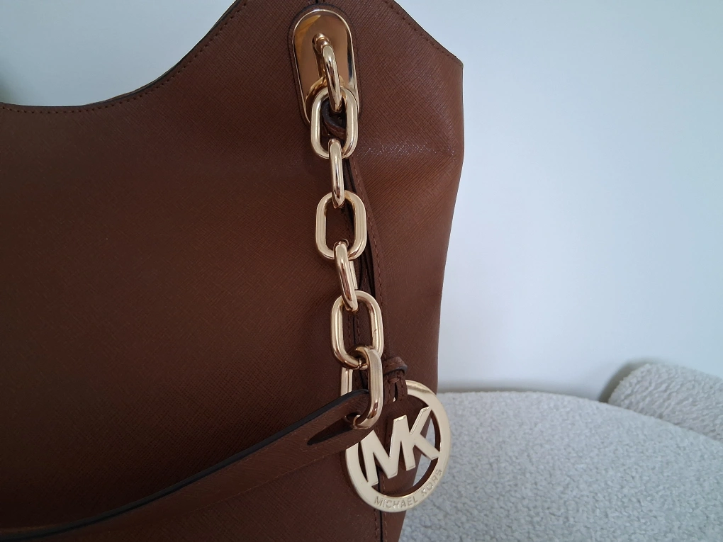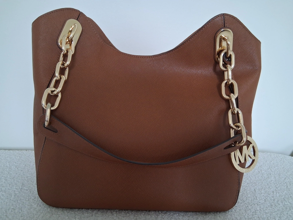 Selling a Michael Kors shoulder bag in a lovely brown colour. It's in great condition and features gold-tone hardware, including a chain and the MK logo charm. The interior lining also has the Michael Kors logo printed throughout.