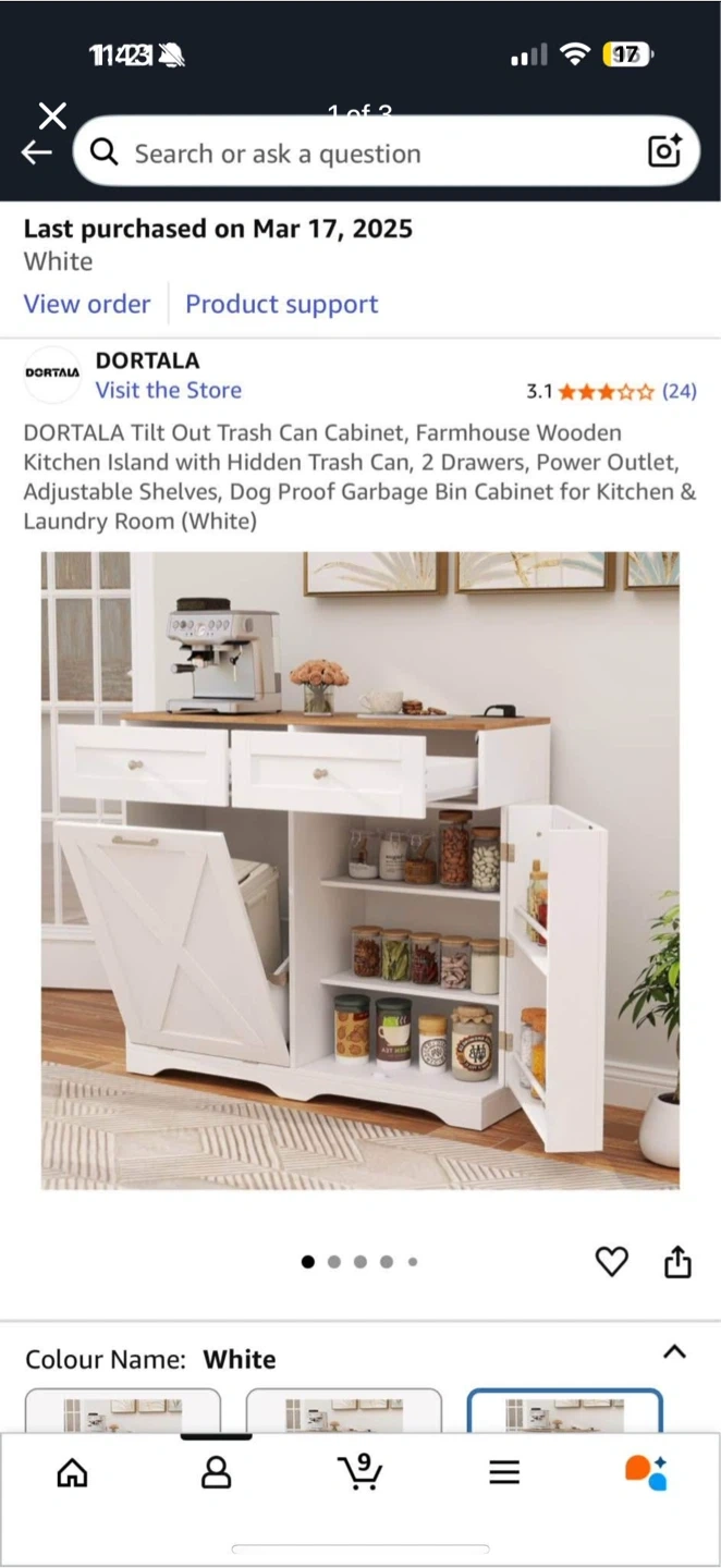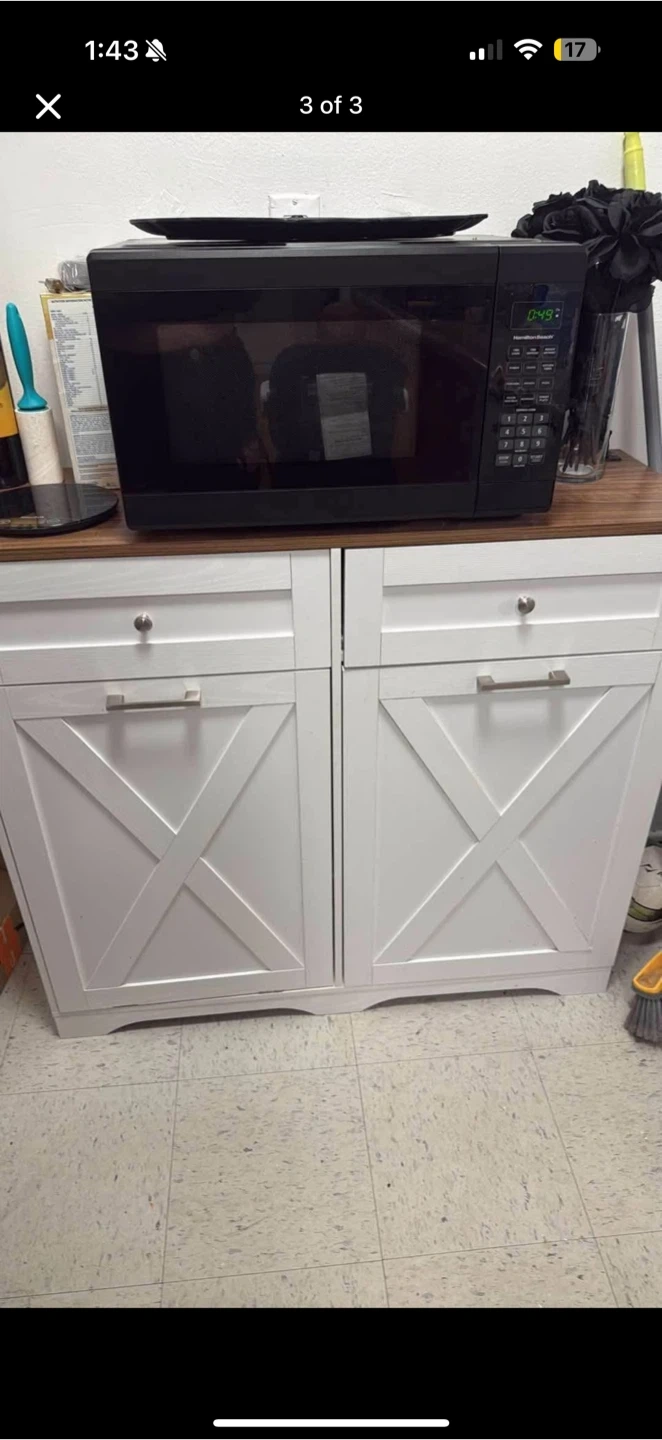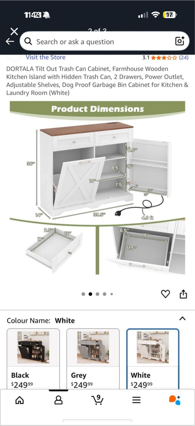 28Selling a DORTALA farmhouse wooden kitchen island in white. It features a tilt-out trash can cabinet, two drawers, a power outlet, and adjustable shelves. It's also dog-proof! Dimensions are visible in the photos. Originally bought for $249.99