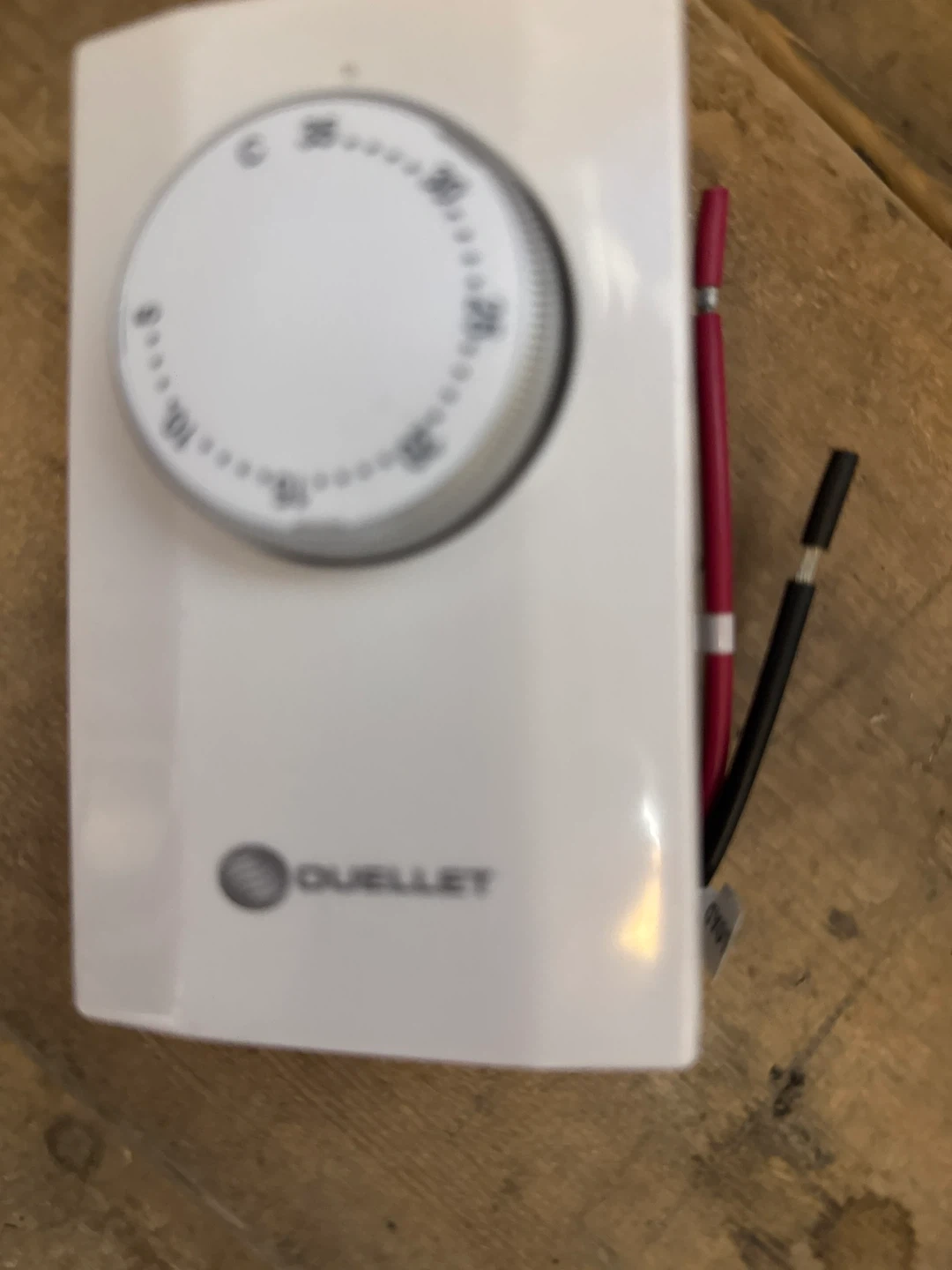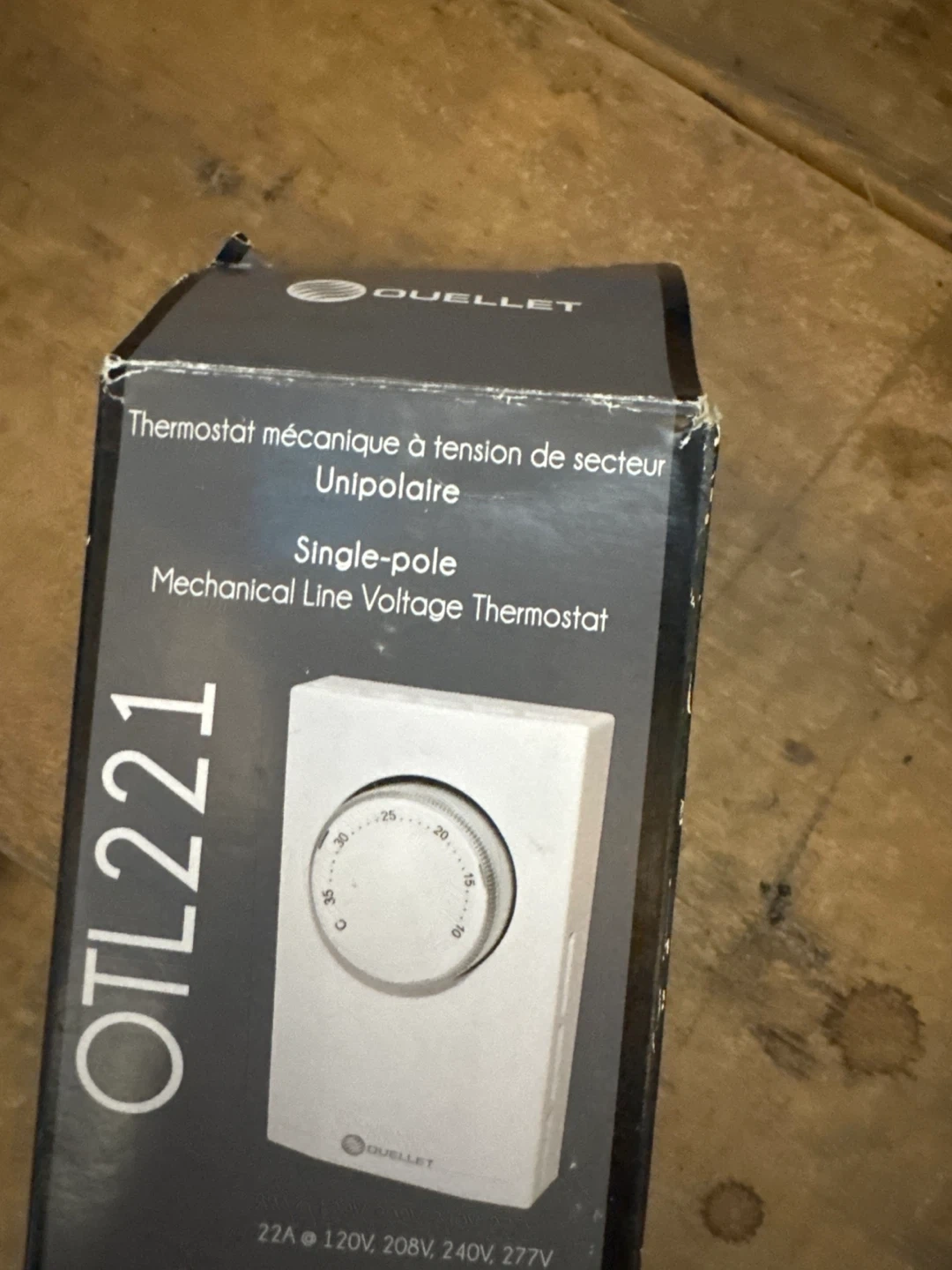 Selling a Ouellet OTL221 mechanical line voltage thermostat. It's a single-pole unipolar thermostat. The box is included