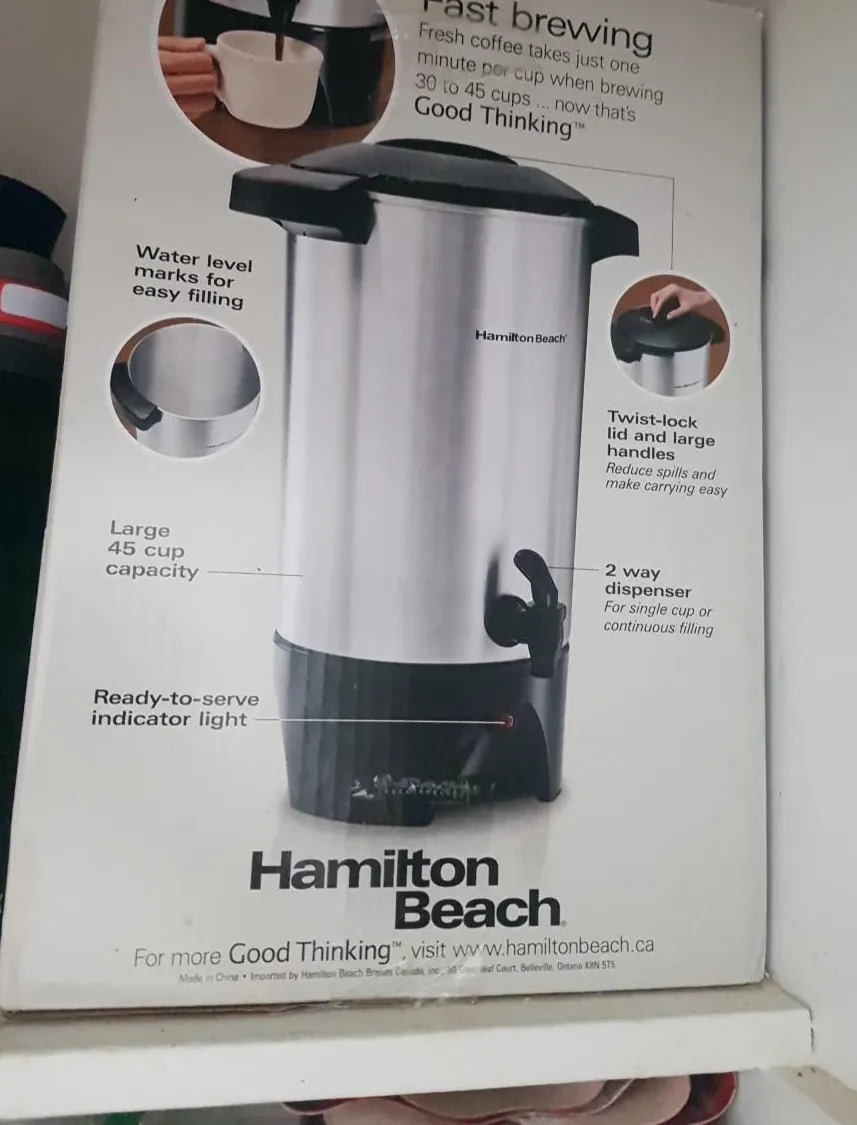 Selling a Hamilton Beach coffee urn with a large 45-cup capacity! It features water level marks for easy filling and a ready-to-serve indicator light. The twist-lock lid and large handles reduce spills and make carrying easy. It also has a 2-way dispenser for single cup or continuous filling.