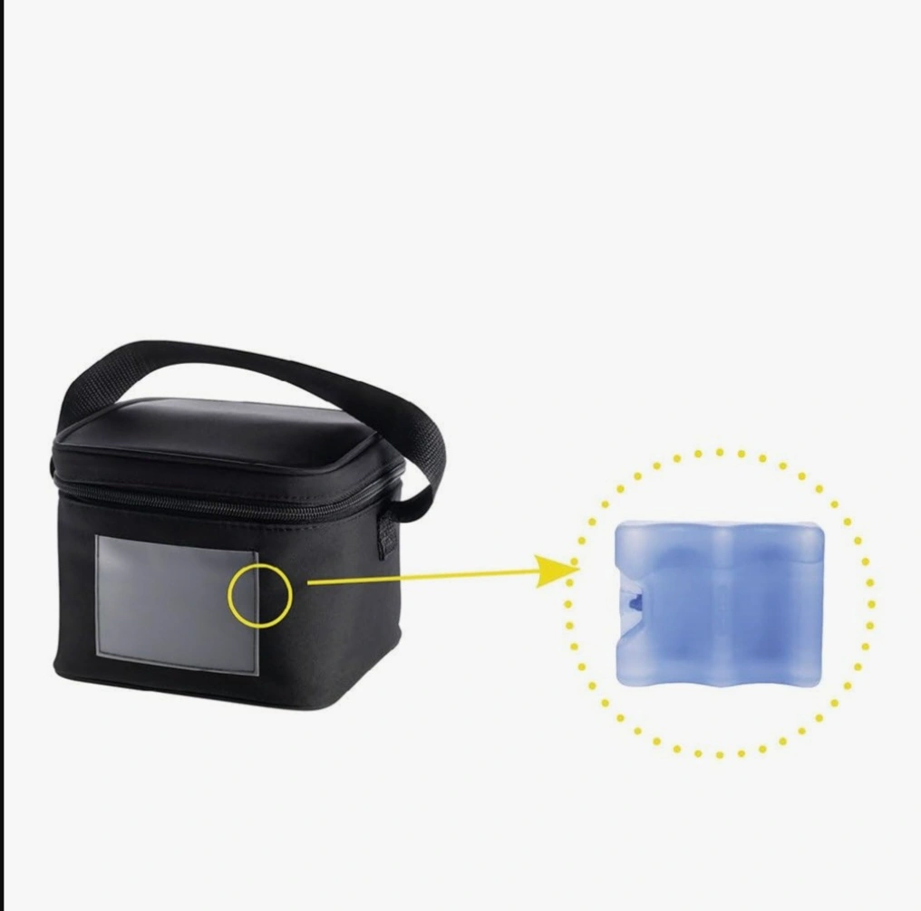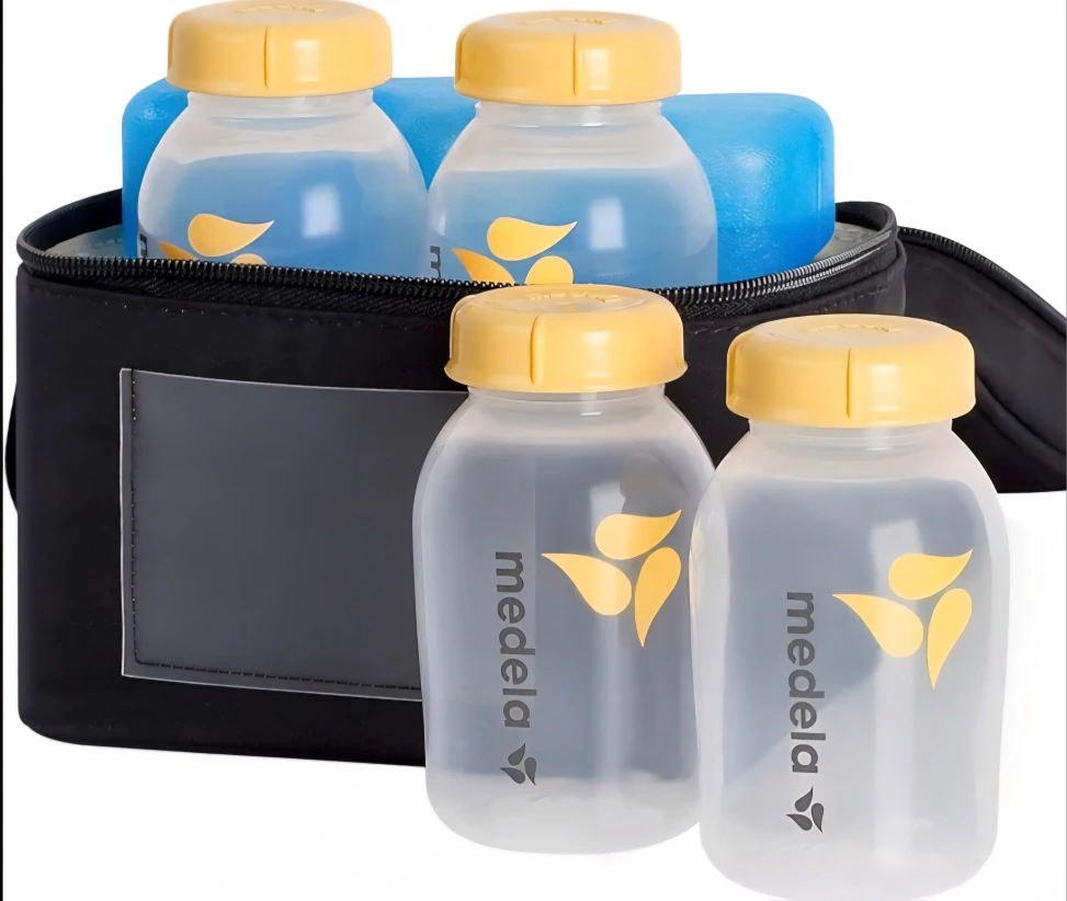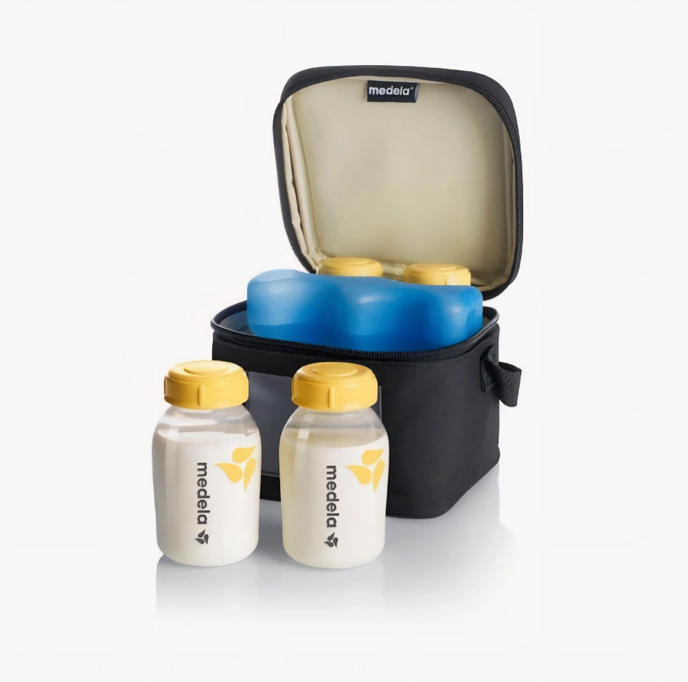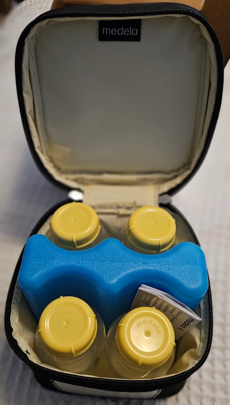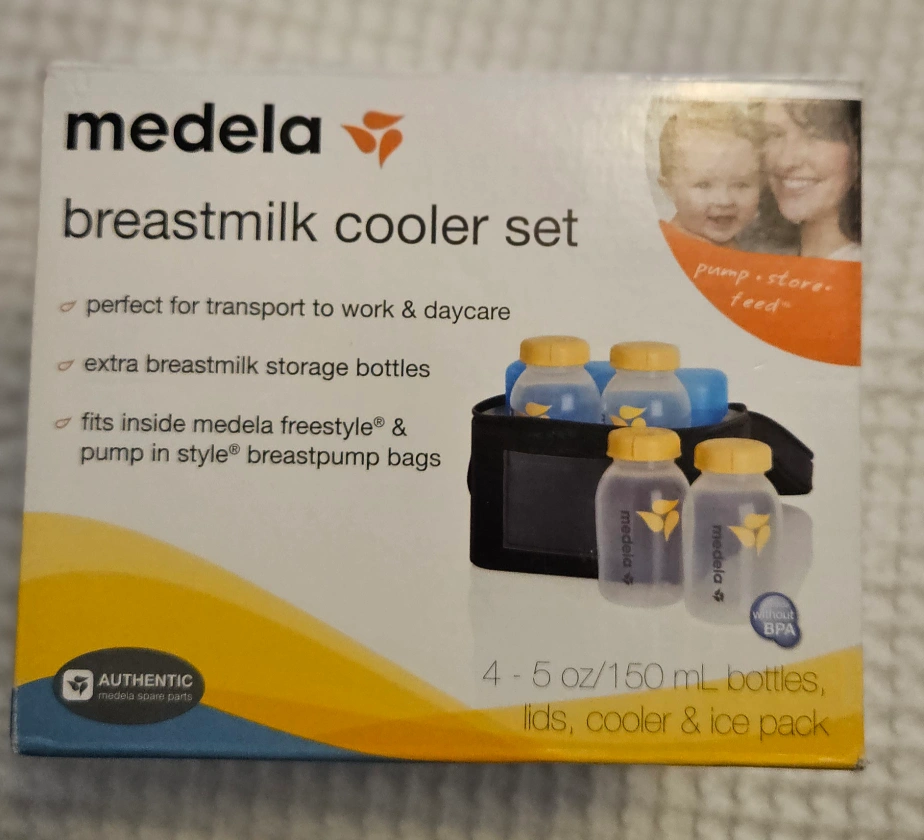 Medela breastmilk cooler set! It's perfect for transporting milk to work or daycare. The set includes 4-5 oz/150 mL bottles, lids, a cooler, and an ice pack. It also fits inside Medela Freestyle and Pump in Style breast pump bags -Open Box