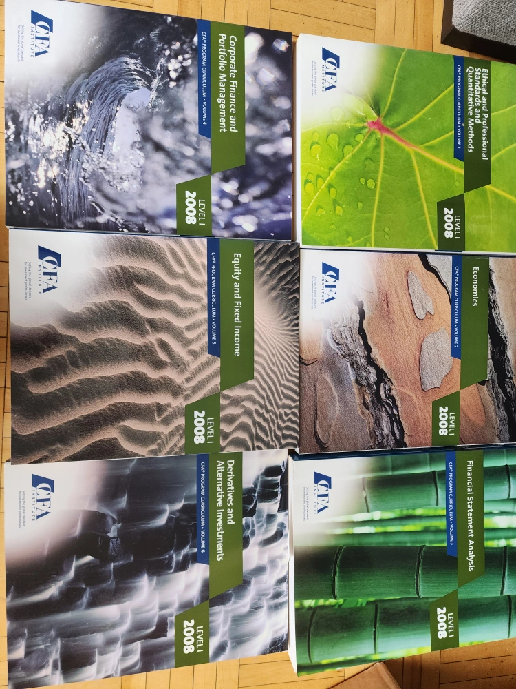 Selling a complete set of CFA (Chartered Financial Analyst) Program Curriculum books for Level I, dated 2008. Includes all volumes: Ethical and Professional Standards and Quantitative Methods, Economics, Corporate Finance and Portfolio Management, Equity and Fixed Income, Derivatives and Alternative Investments, and Financial Statement Analysis. Perfect for anyone studying for the CFA exam!