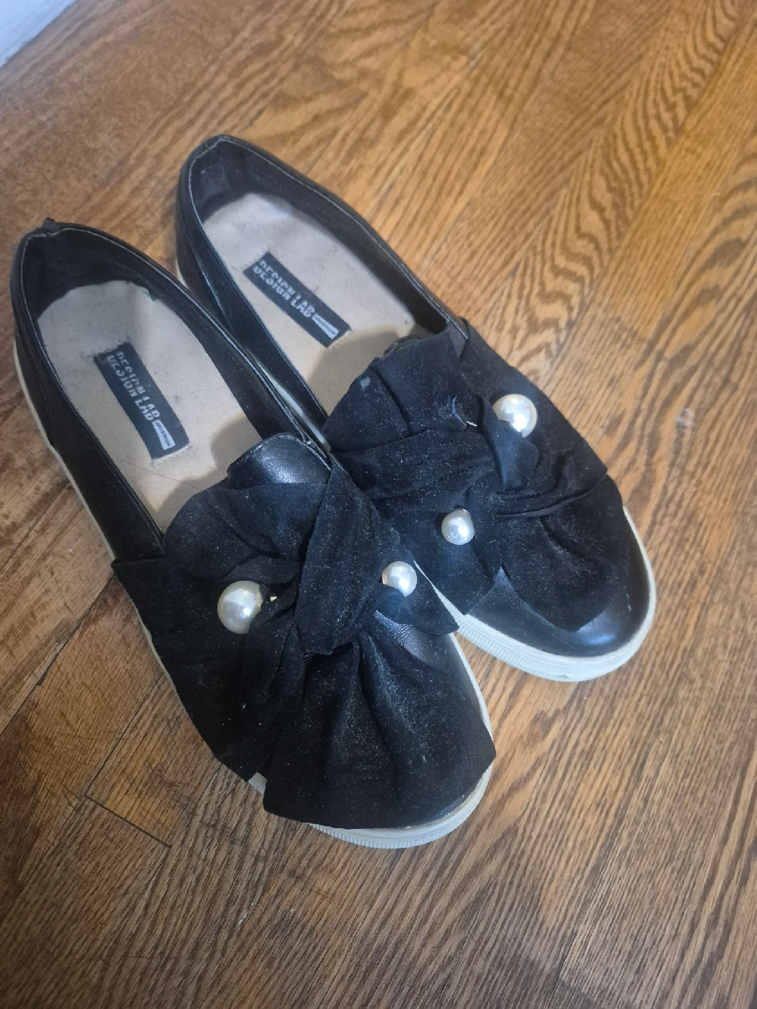 Cute pair of Design Lab slip-ons! They're black with pearl embellishments and in great shape. Perfect for adding a touch of style to your casual outfits