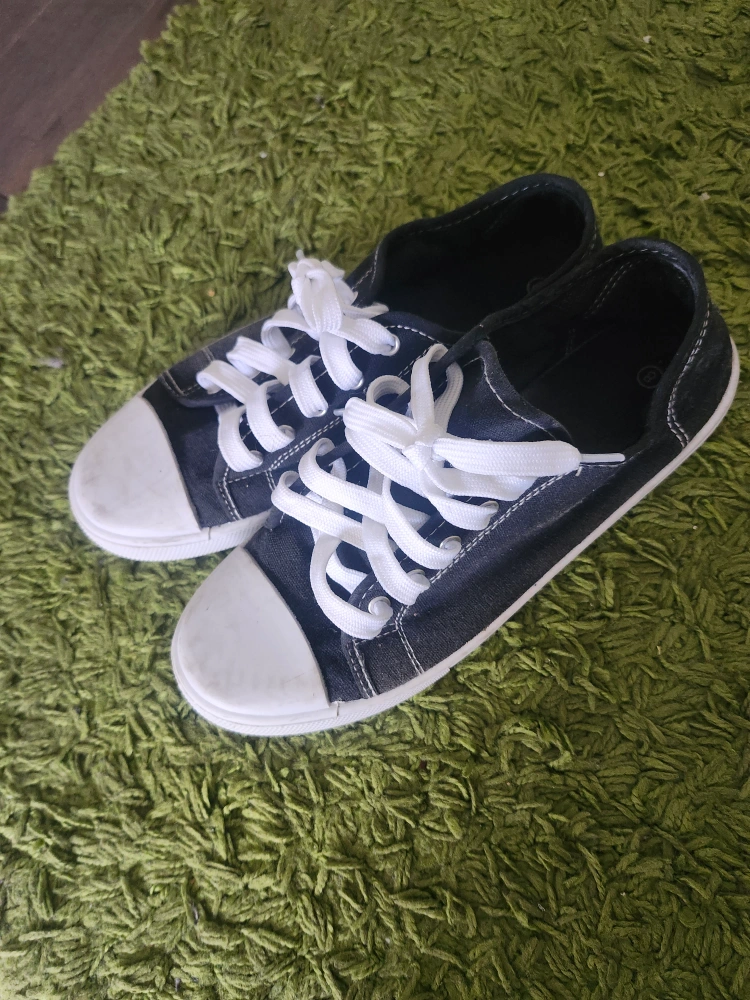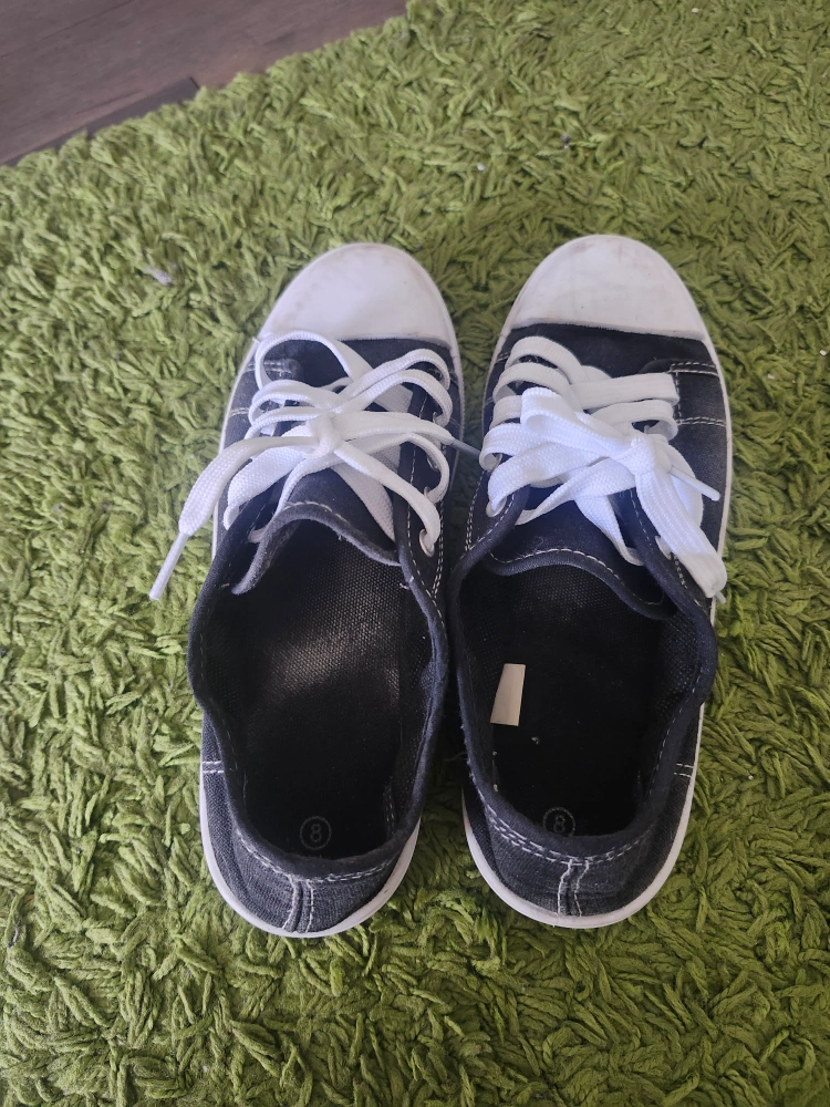 Selling a pair of canvas sneakers in black and white. They're in good condition and are a size 8. Perfect for casual wear!