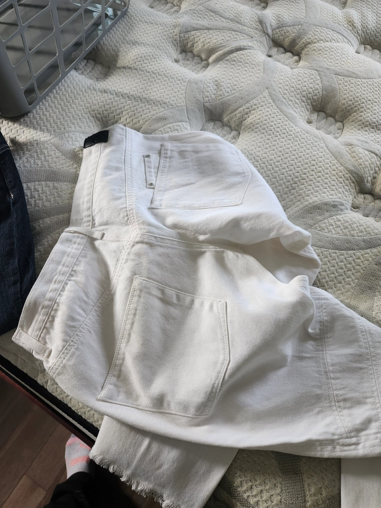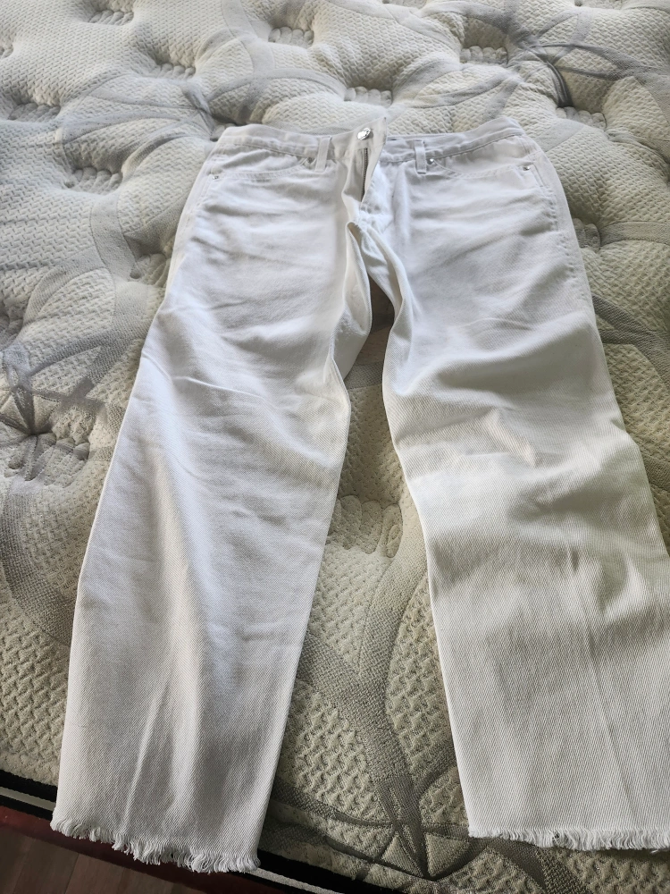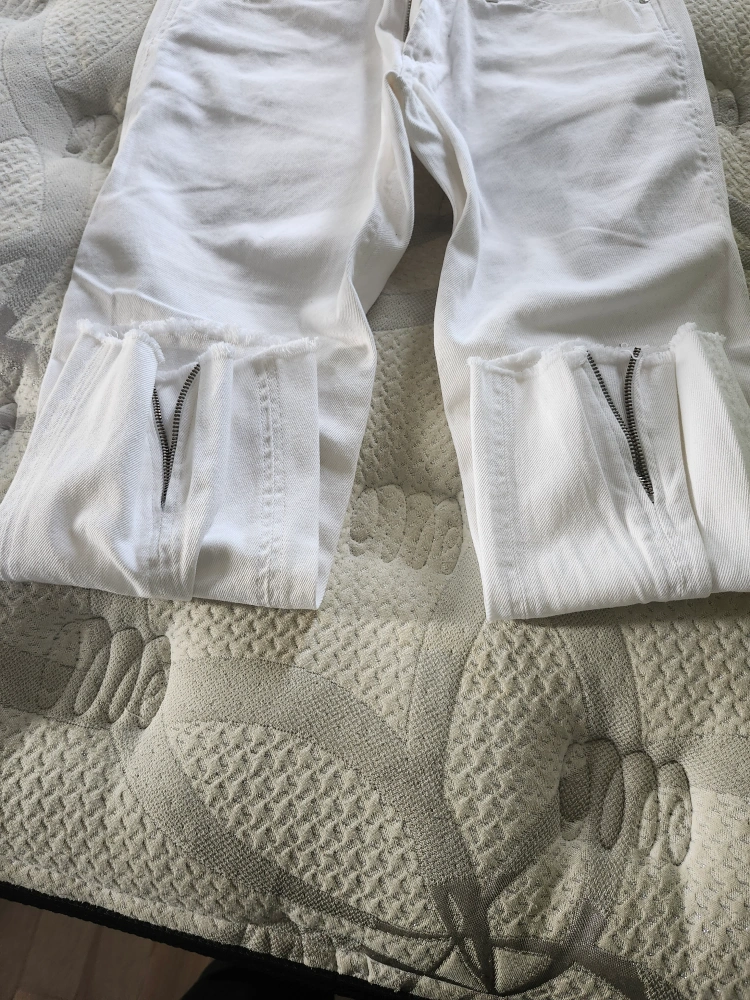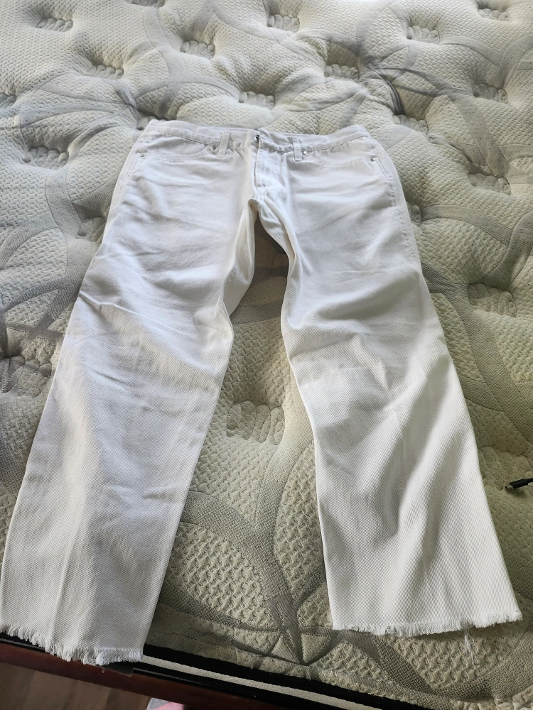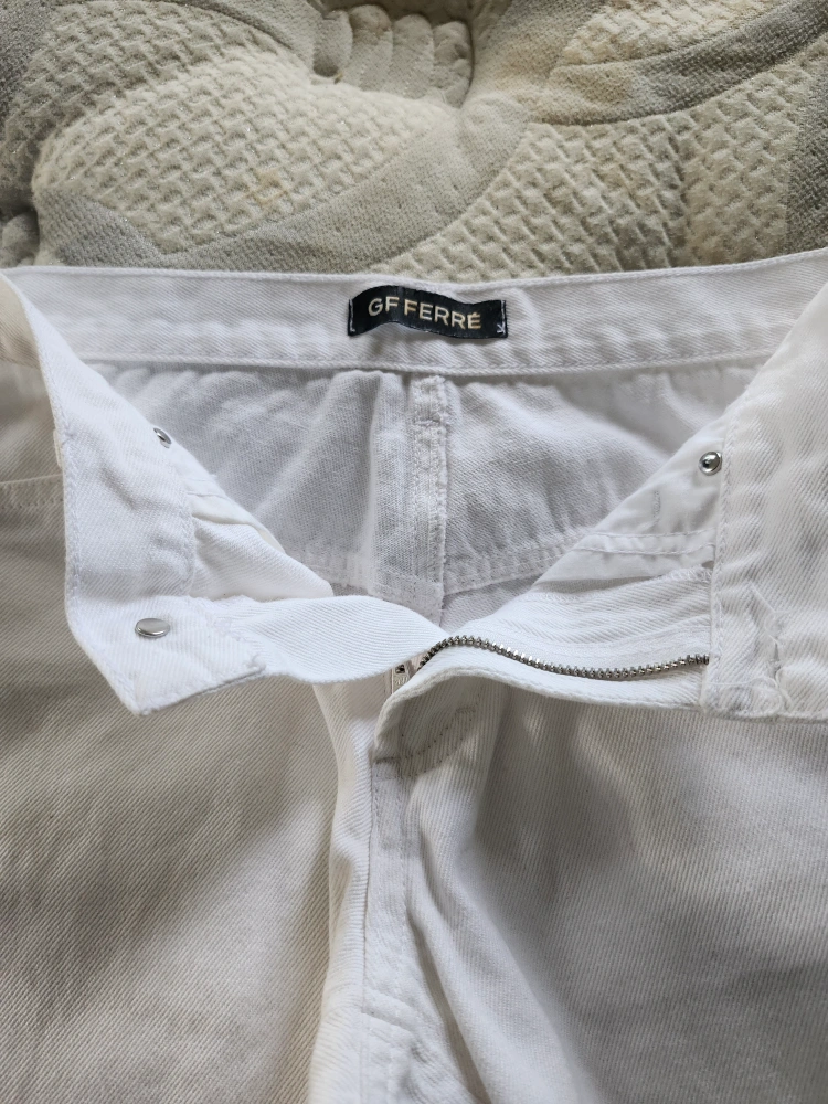 Selling a pair of GF Ferre white jeans in size 34! They're in great condition and ready for a new home. The frayed detailing at the bottom adds a unique touch. They are made of a comfortable material and the perfect addition to your wardrobe!