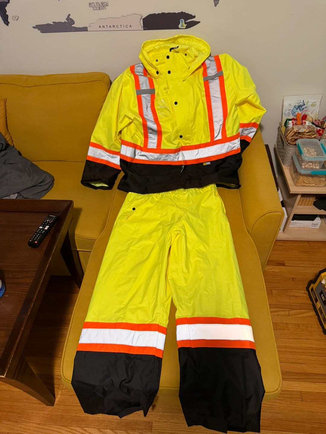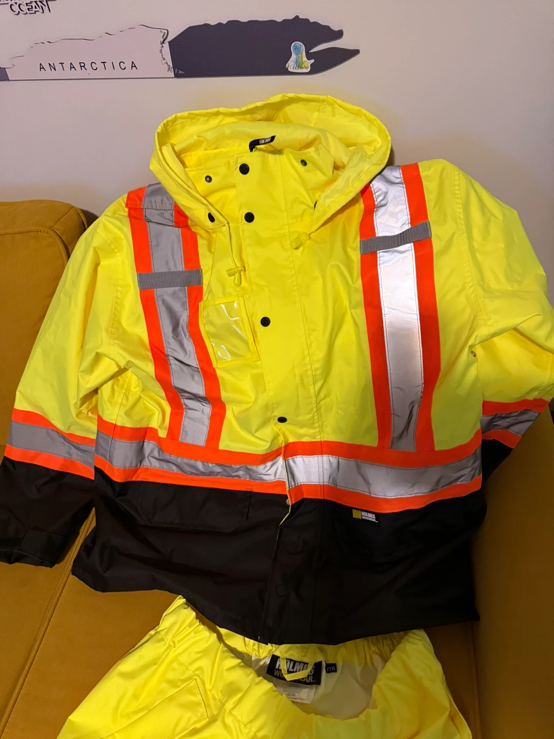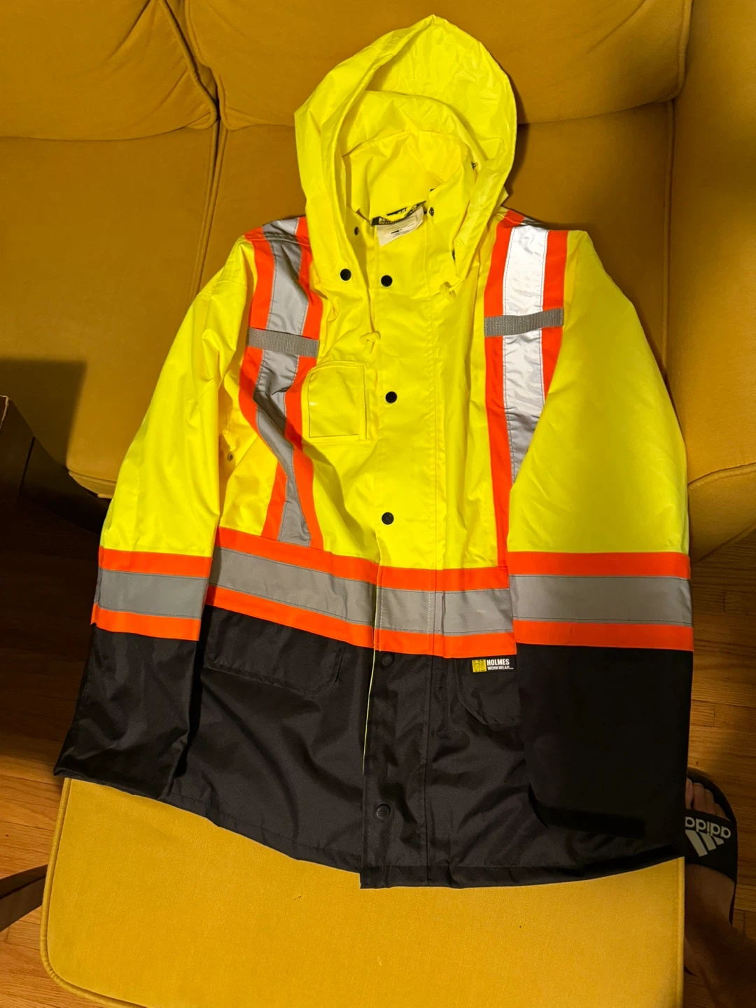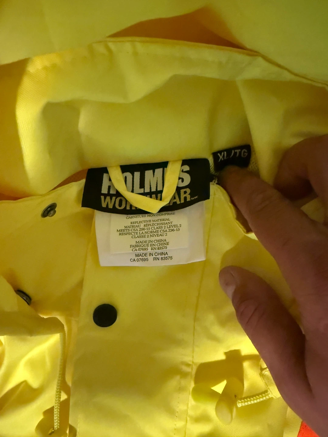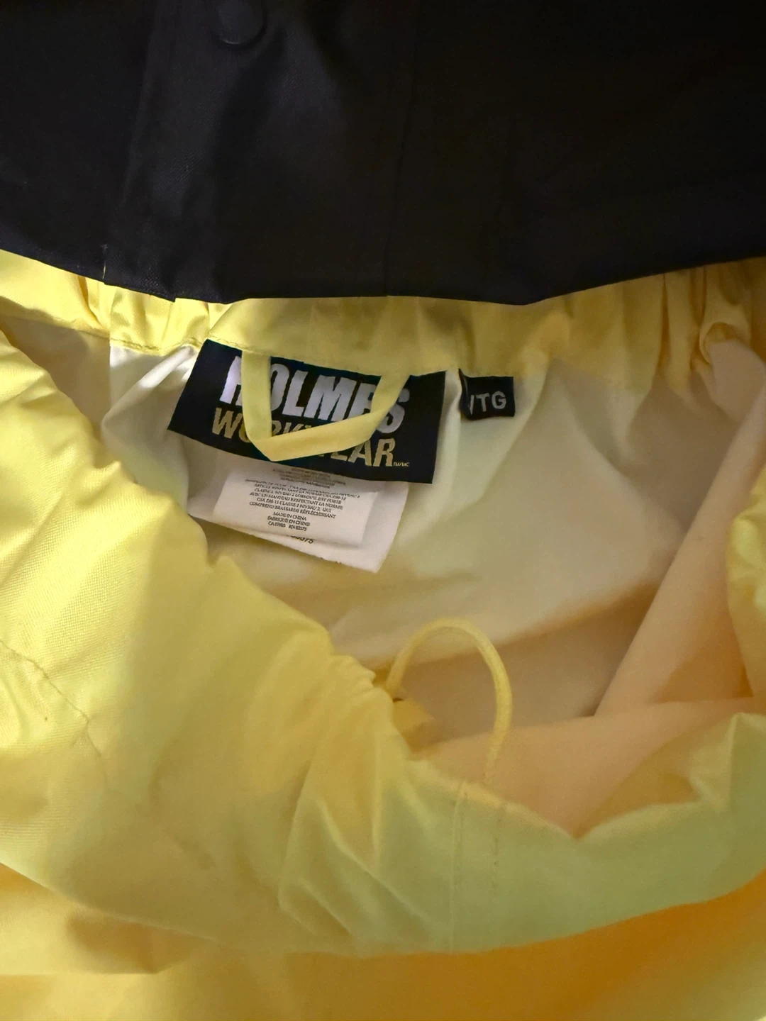 I am selling a Holmes Workwear high-visibility rain suit that is in good condition, including both the jacket and pants to keep you dry and seen in any weather.