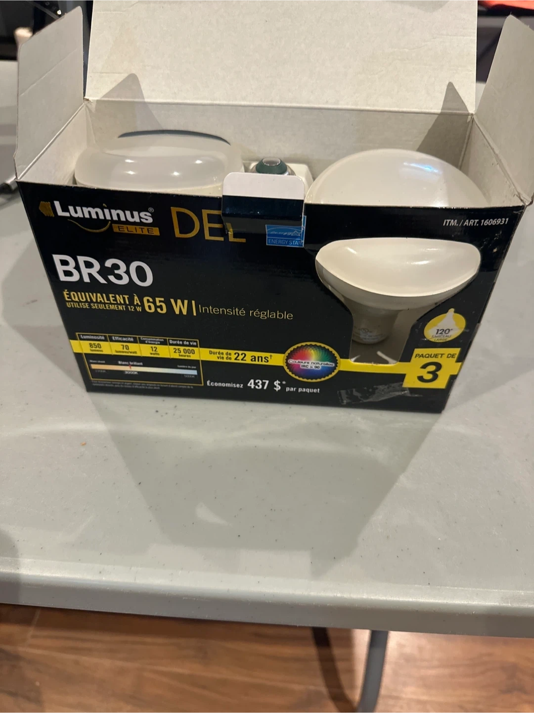 Selling a pack of 3 Luminus Elite BR30 LED light bulbs. These bulbs are equivalent to 65W but only use 12W. They have a lifespan of 22 years and emit 850 lumens.