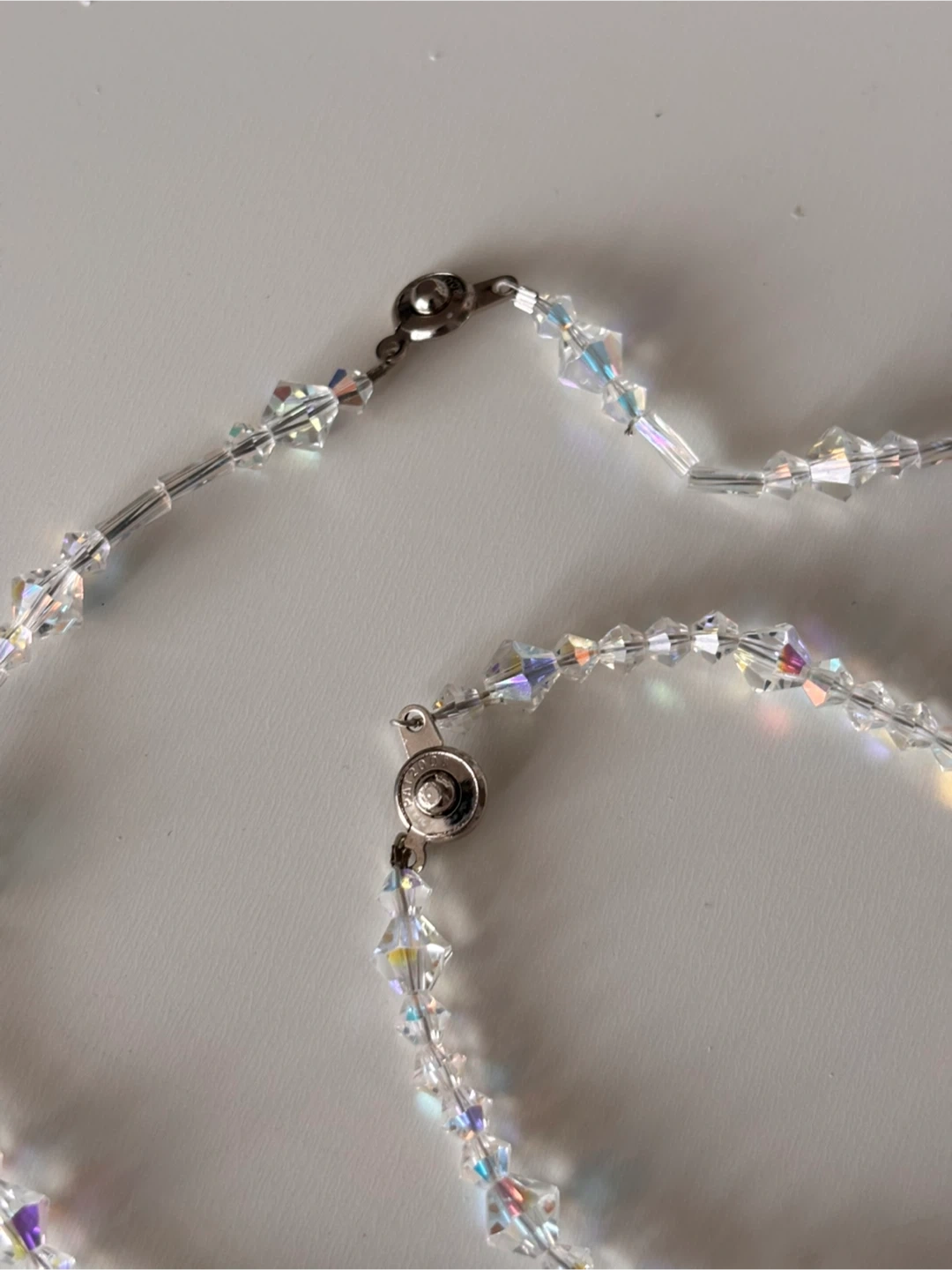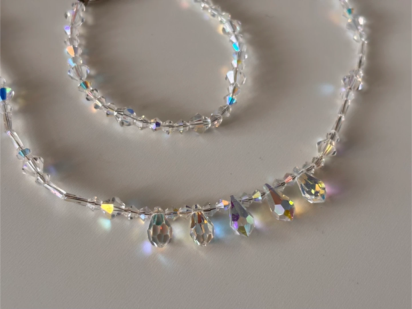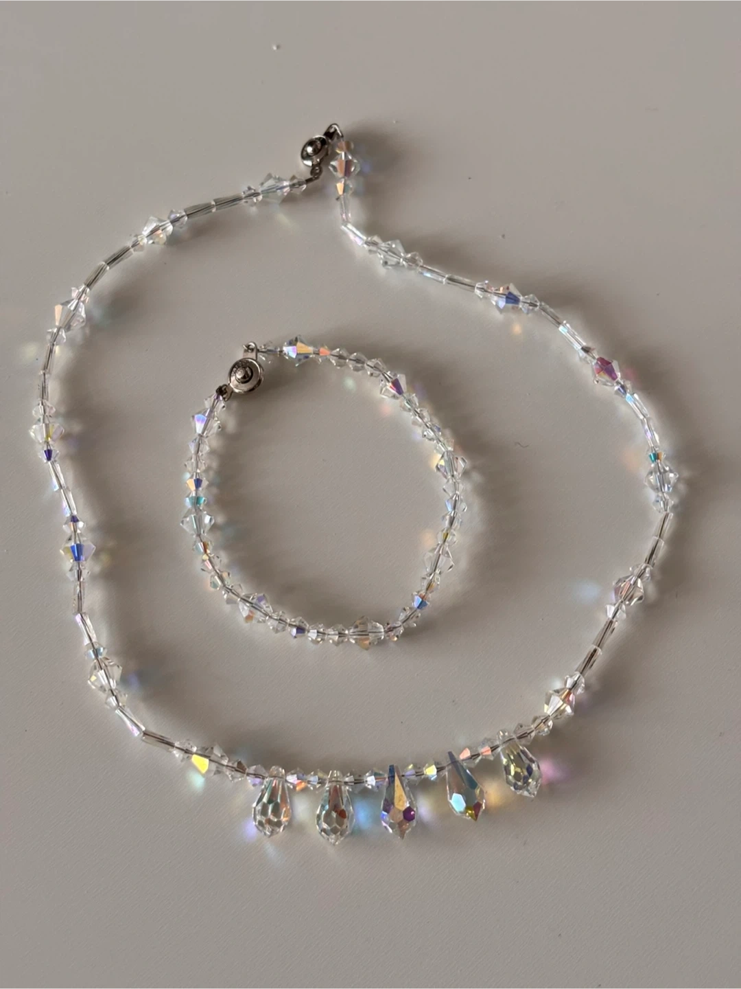 Selling a beautiful iridescent crystal bead necklace and bracelet set. The crystals have a lovely shimmer and would be perfect for dressing up any outfit. They are in great condition and ready for a new home!