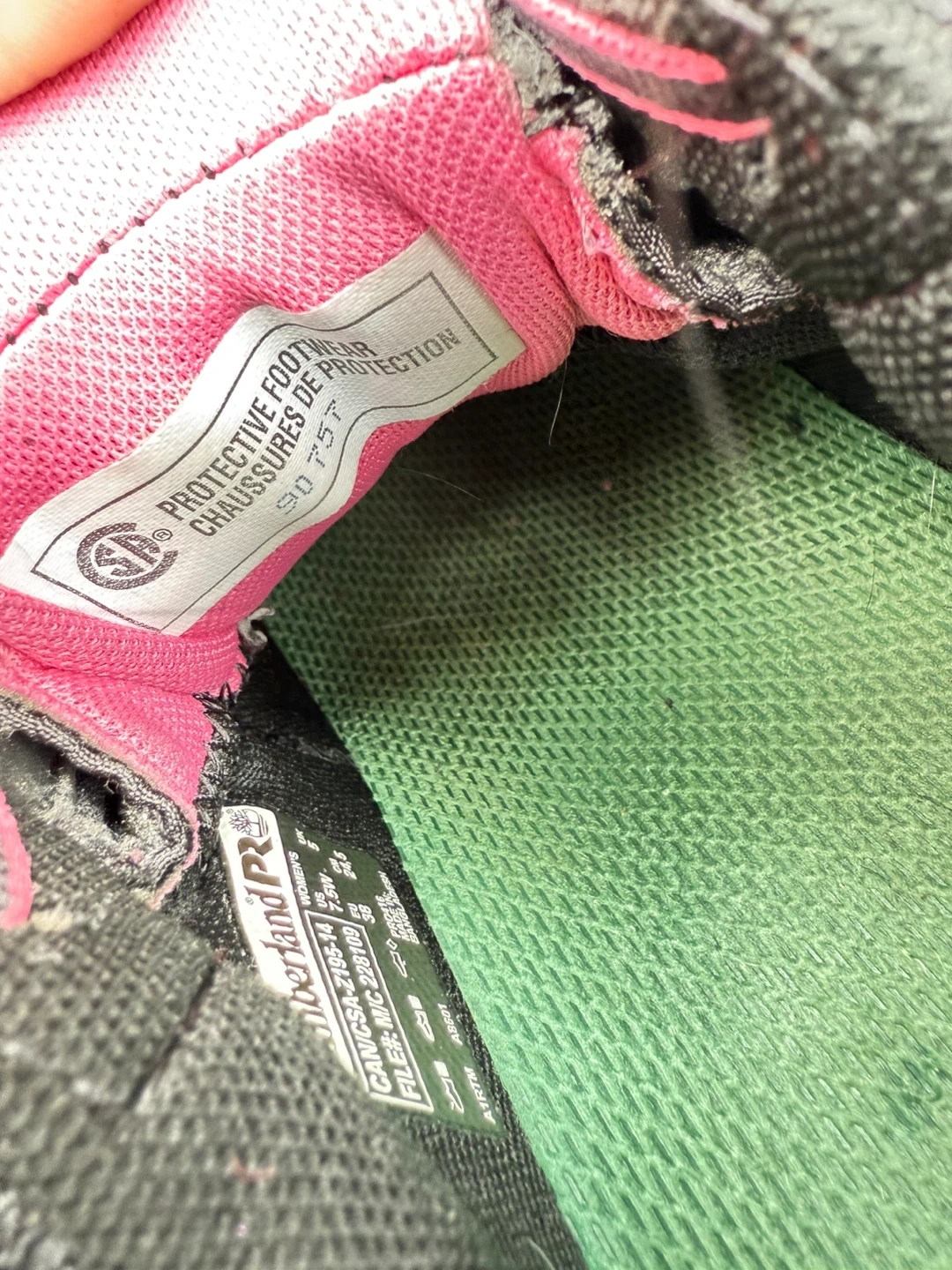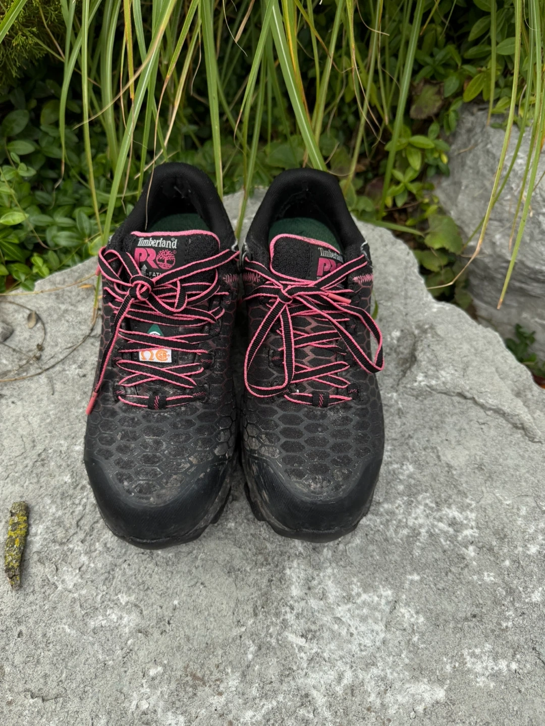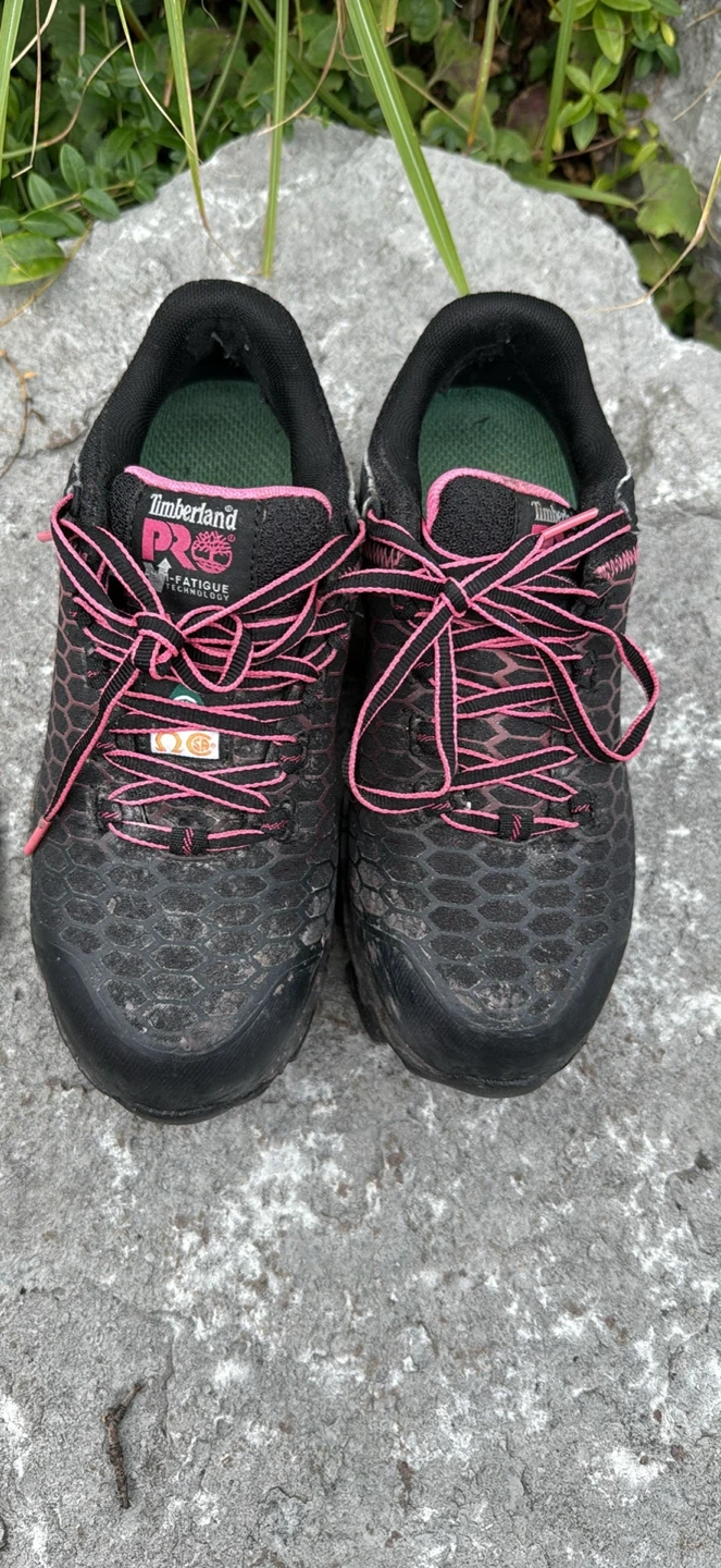 Selling a pair of Timberland PRO women's work shoes in size 7.5W. They're in used condition, as you can see from the soles, but still have lots of life left. Great for anyone needing reliable footwear for work! Still comfortable after 6 months of wear!! worked at lush manufacturing in the bubbles department so the stains on the bottom are all soaps 🩷