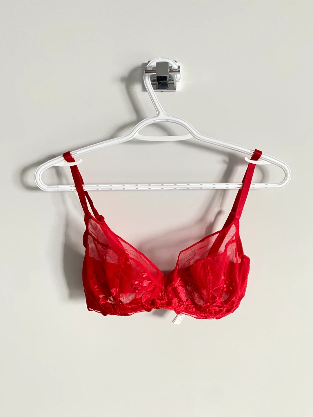 Never worn beautiful red mesh embroidered bra from Triumph, size 32 D, adjustable straps and hooks, full coverage support, underwired and unlined, Bow details in centre!