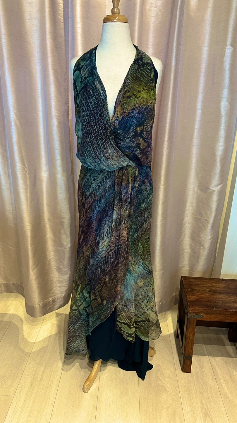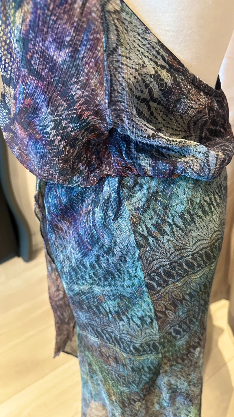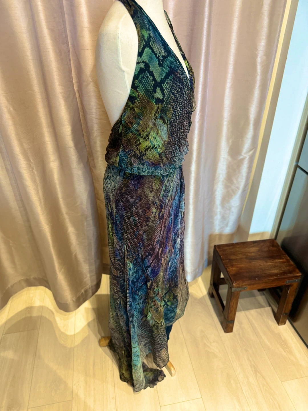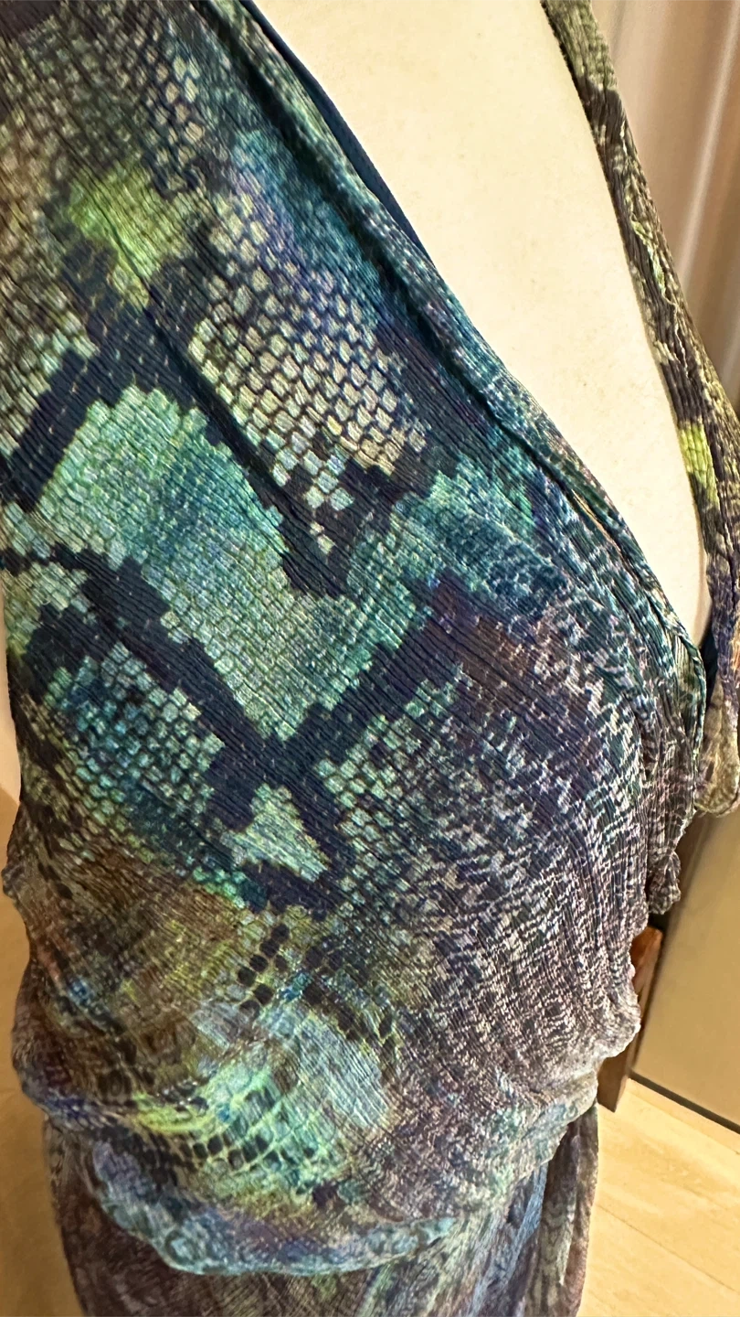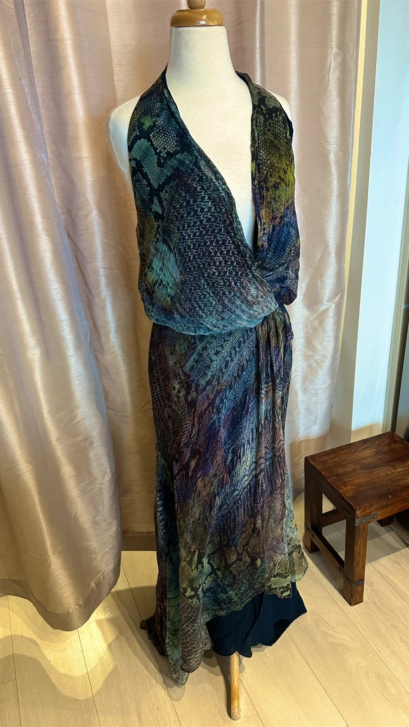 1000+This is a real vintage gem! It features a snakeskin print in shades of blue, green, and purple. The dress is made of 100% silk, making it lightweight and comfortable for summer events