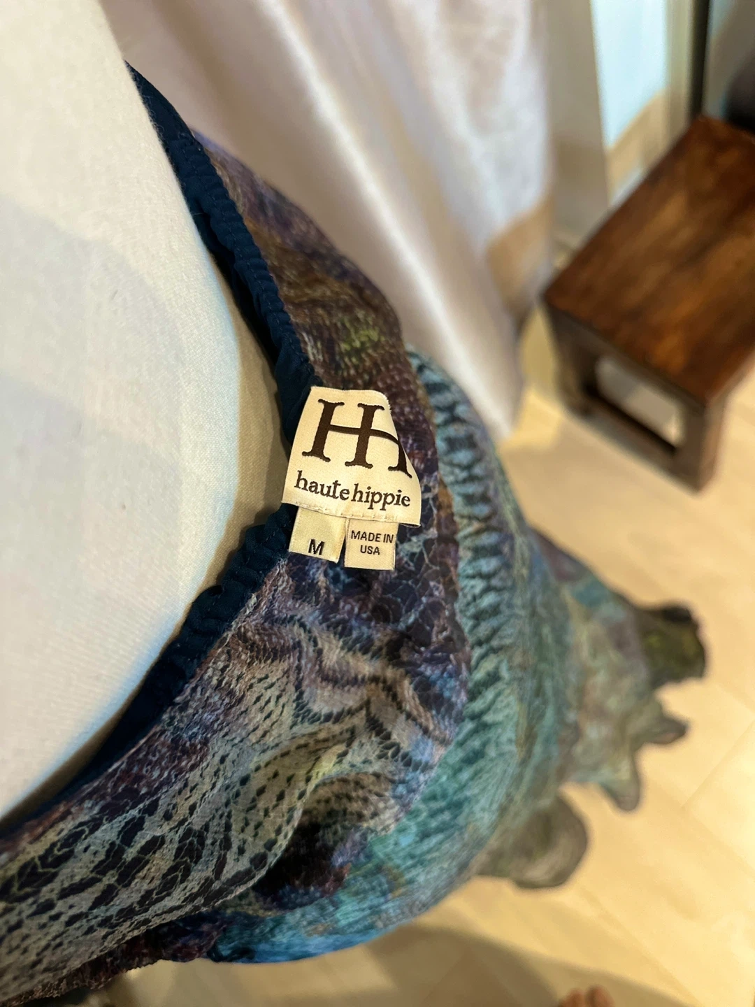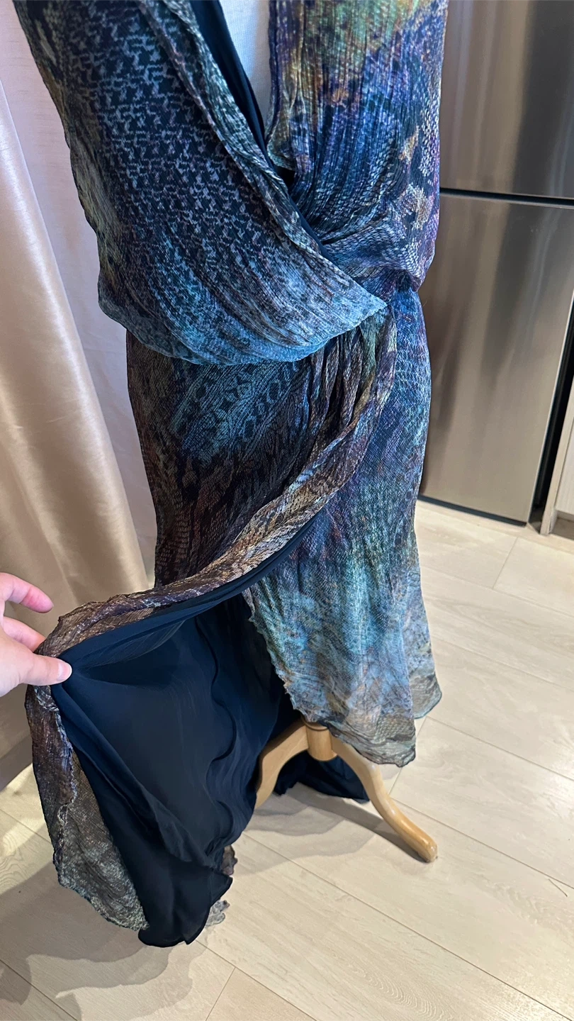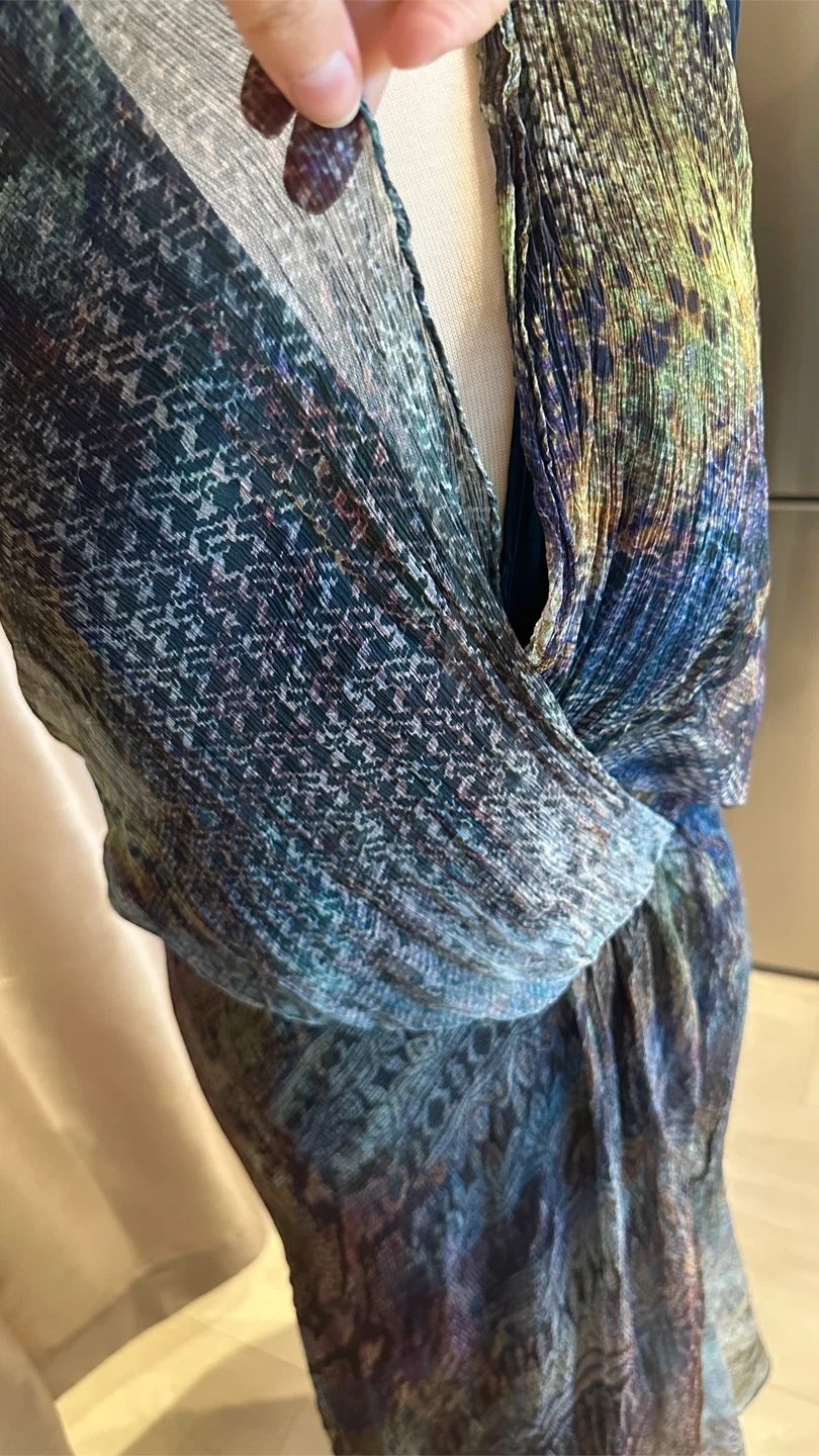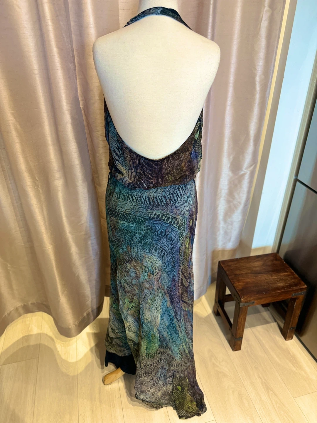 1000+This is a real vintage gem! It features a snakeskin print in shades of blue, green, and purple. The dress is made of 100% silk, making it lightweight and comfortable for summer events