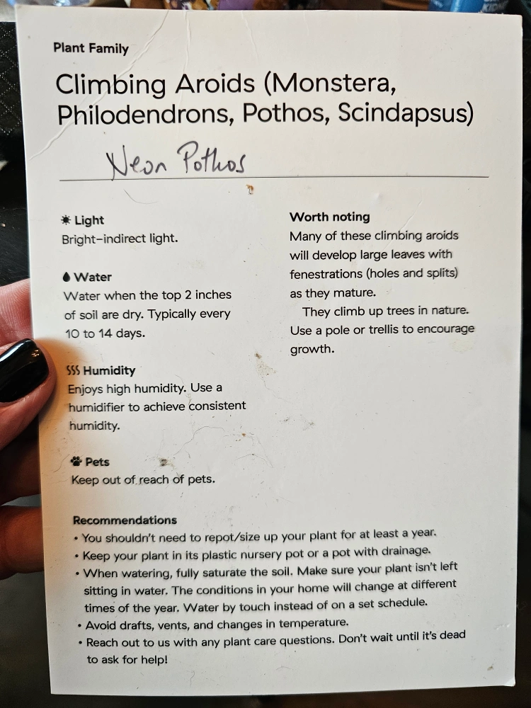 Selling (1) beautiful Neon Pothos hanging plant ready to brighten up your space! It thrives in bright, indirect light and enjoys humidity. Water when the top two inches of soil are dry, typically every 10 to 14 days. Keep away from pets