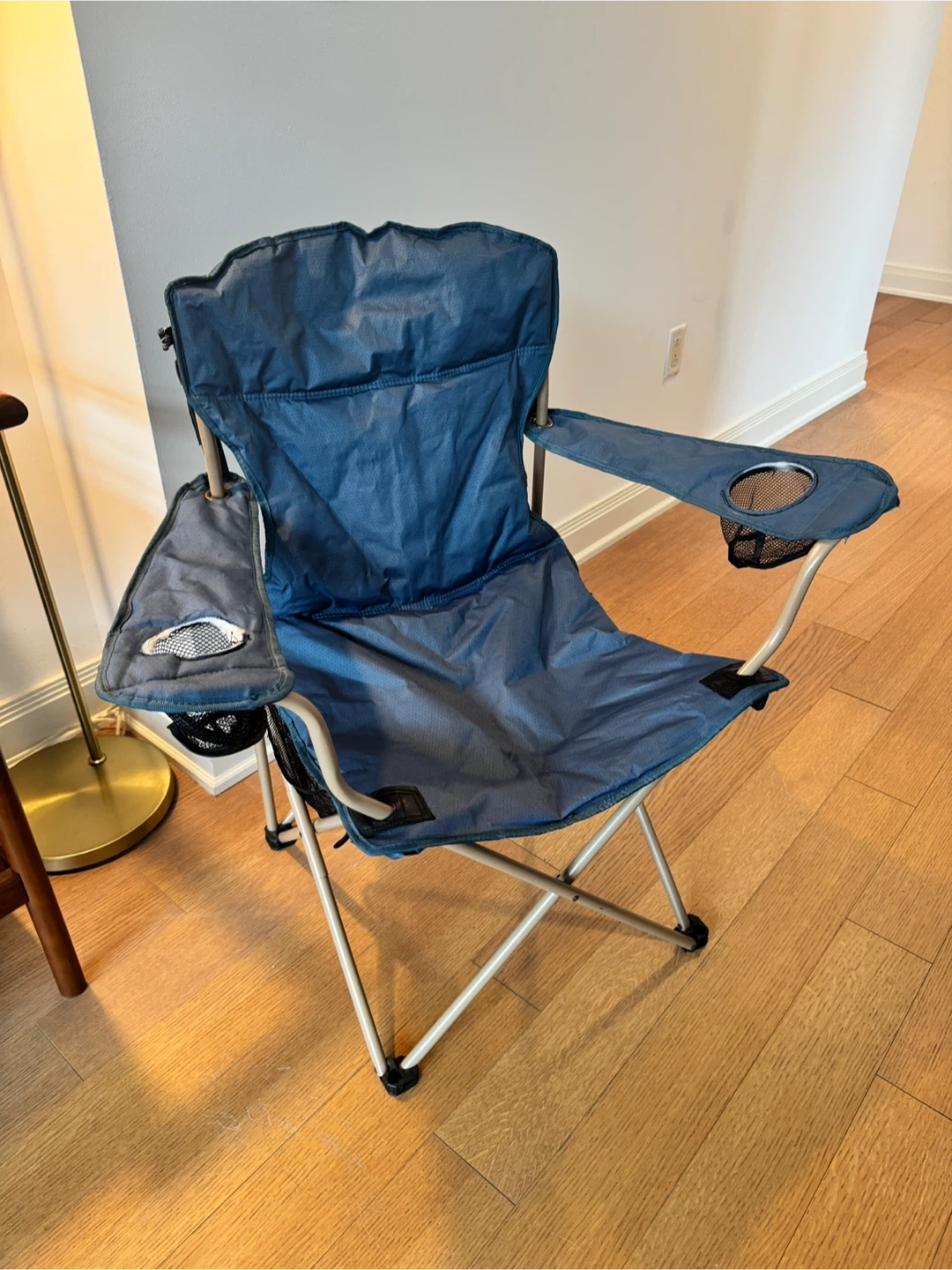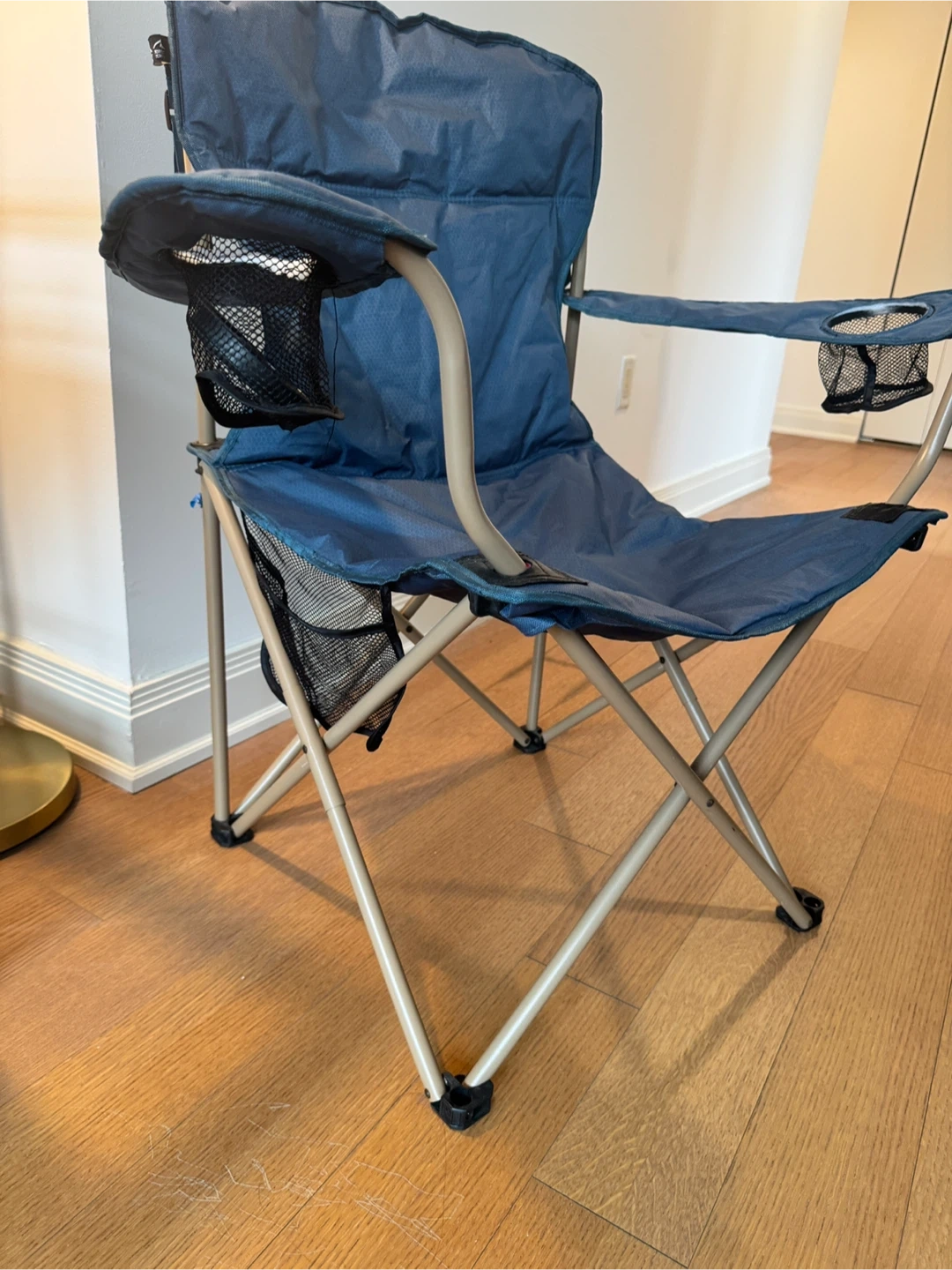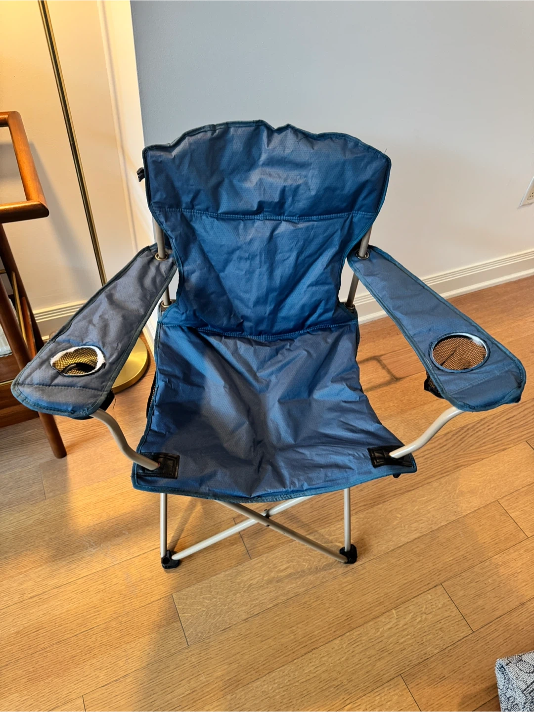 I'm selling a blue folding camping chair. It's in great condition and perfect for outdoor activities. It features convenient cup holders on both armrests for your drinks and snacks