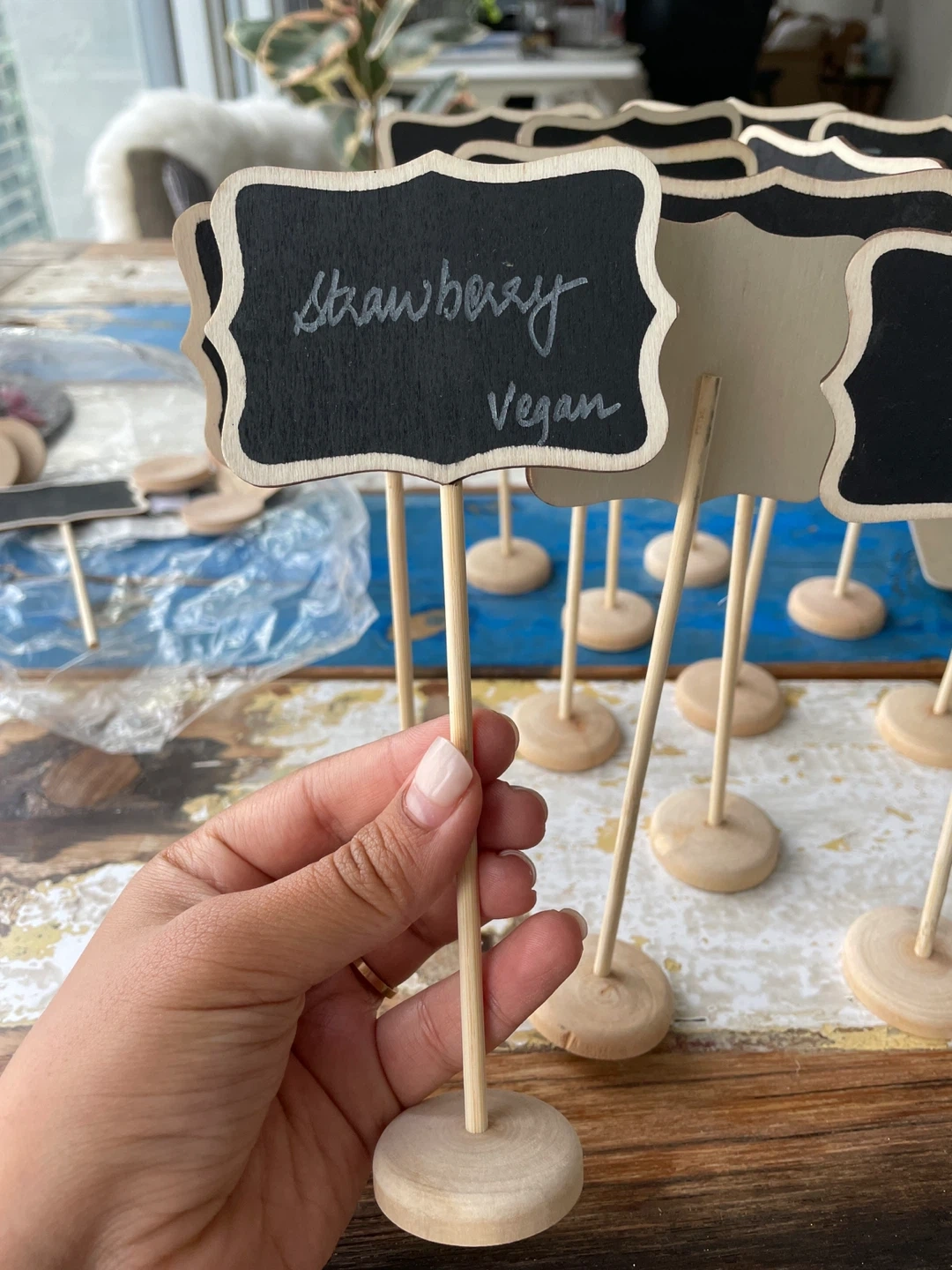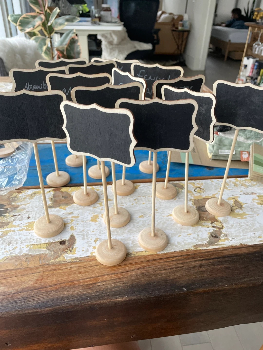 Add a touch of rustic charm to your garden or buffet with these chalkboard label stakes! Perfect for identifying plants, labeling food at parties, or adding a decorative touch to your home. They're in great condition and ready to use
