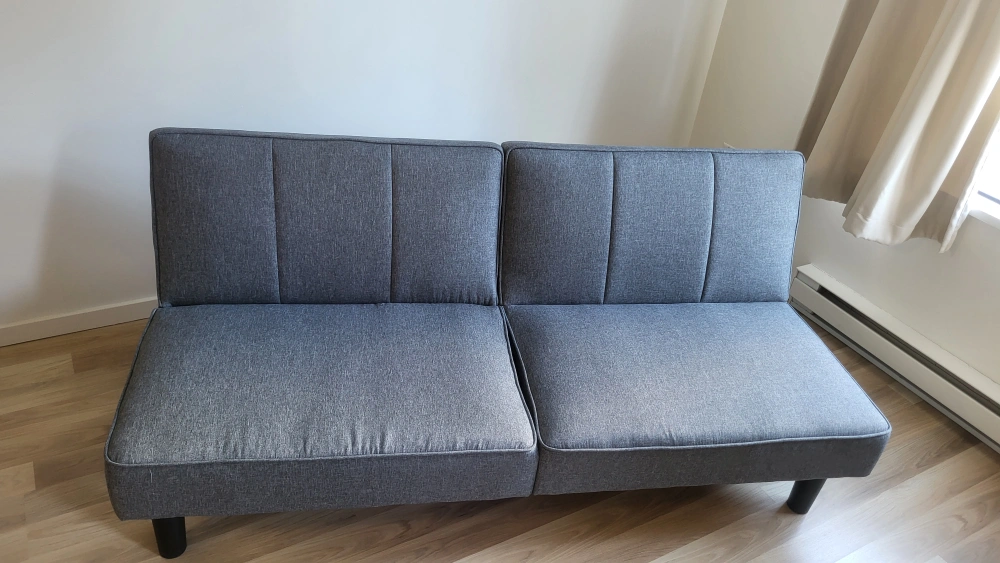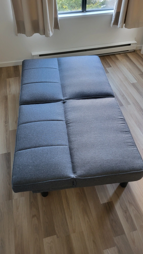 Used folding futon. 170 cms (length) X 95 cms (width) when unfold. Honestly, it is not very comfortable. You may use it as sofa if you are just arriving and trying to settle down. I don't recommend to sleep there, it is not soft at all. Again good for newcomers who are trying to save some money as it is free, just need to come and pick it up. It will be unassembled and packed in the original box