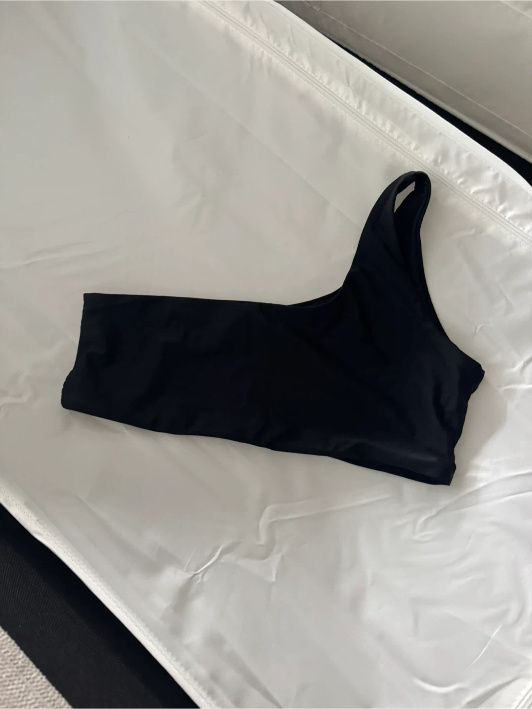 Selling a stylish black one-shoulder swim top! It's in great condition and would be a lovely addition to any wardrobe